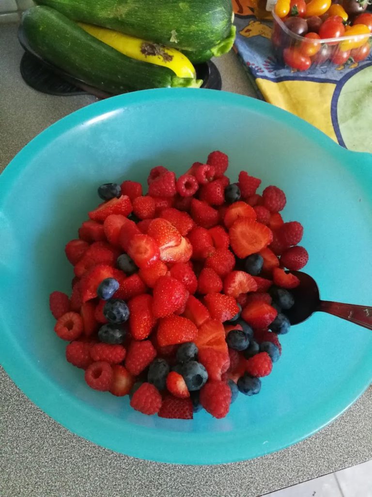 Nossos amigos Caro e Mathieu vêm almoçar conosco no jardim, e nos preparam uma salada de frutas tão deliciosa com chantilly caseiro (miaaamm – esqueci de tirar uma foto da sobremesa, porque comi muito rápido)