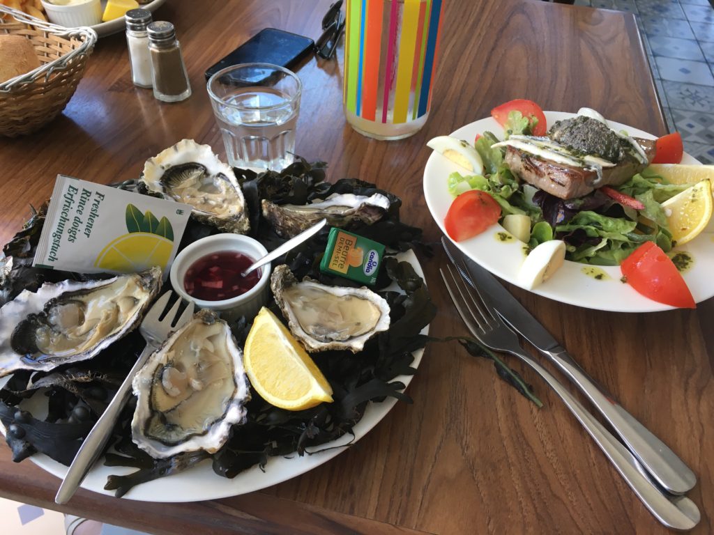 Hoje, Caro e Mathieu (que moram em Nantes) me pegam em casa e me levam para Batz sur Mer, para um delicioso almoço de frutos do mar em L’aporrhais. Esqueci-me como as ostras podiam ser boas, como adorava comê-las. Se você for ao mesmo restaurante, lembre-se de reservar no terraço, é à sombra e haverá menos barulho