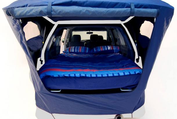 Com os colchões e o cobertor dobrados, ainda parece muito “volumoso” na parte de trás do carro. Bem, isso é verdade para todas as carrinhas, não só para as naves espaciais, mas quero dar-te uma opinião honesta. Também não é possível deixar a cama “aberta” o tempo todo porque de outra forma não teríamos acesso ao frigorífico e aos utensílios de cozinha
