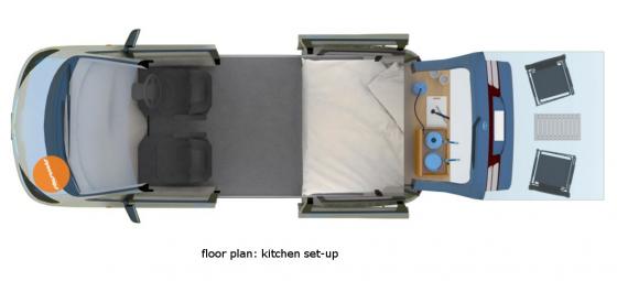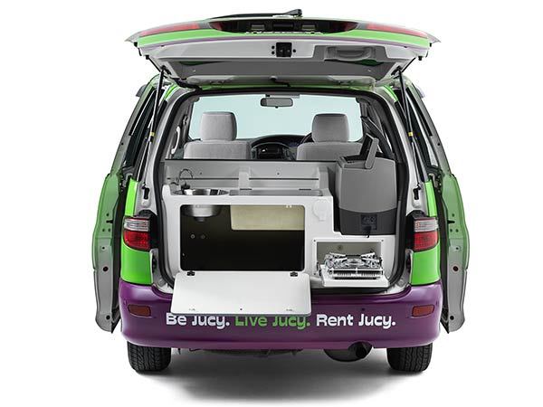 Você tem que pegar o cesto de utensílios (e empurrar os colchões para abrir o espaço de armazenamento a cada vez). Enquanto que com outras empresas de carrinhas, basta abrir o porta-bagagens e tudo está à mão. Eu mostro-te a cozinha do Jucy para comparação