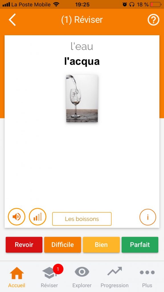Este método também lhe permite trabalhar a compreensão oral, porque primeiro aprende novas palavras ouvindo o italiano. É ao virar o cartão que descobrimos o seu significado