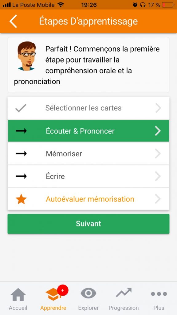 O que eu gosto neste método é o seu sistema de repetição espaçada: nós revisamos no momento em que estamos prestes a esquecer. Por isso não temos de estudar todos os dias. Para saber quando você deve revisar esta ou aquela palavra, o sistema lhe mostra uma palavra e então você tem que dizer se o significado dessa palavra volta para você com dificuldade, bem, ou muito bem. Dependendo da sua resposta, o sistema fará com que você estude essa palavra no dia seguinte, em poucos dias, ou em um mês