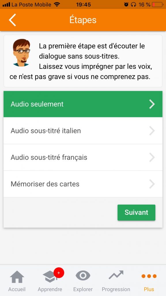 Antes de mais nada, dá confiança ao aluno, entrando na língua através das suas semelhanças com o francês. Ao mesmo tempo que adquire gradualmente uma sólida compreensão da gramática e da estrutura da língua, o utilizador torna-se capaz de construir as suas próprias frases após algumas horas de escuta activa.