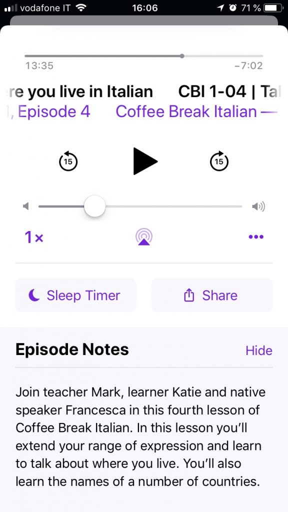 O que é legal sobre o formato podcast é que você pode ouvi-lo na velocidade que quiser, para facilitar a compreensão da conversa em italiano, por exemplo