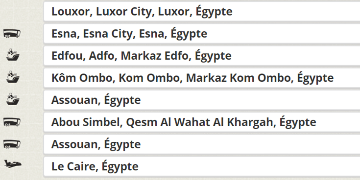 - Opção 2: você o faz por conta própria, privatizando um táxi em Luxor, e levando Uber ao Cairo. No entanto, você não terá mais um guia e terá que ler as explicações sobre o seu Roteiro. Você estará mais exposto (não mais guia para manter os batedores afastados), será arrancado um pouco mais (não muito malicioso esquemas entre 2 e 5 euros), mas você terá mais liberdade => economizando até 200 euros/pessoa