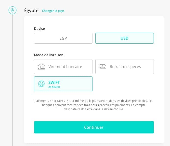 Você deve primeiro escolher o país, a moeda e o método de recepção de sua transação (é até possível solicitar um saque em dinheiro, como para uma União Ocidental).