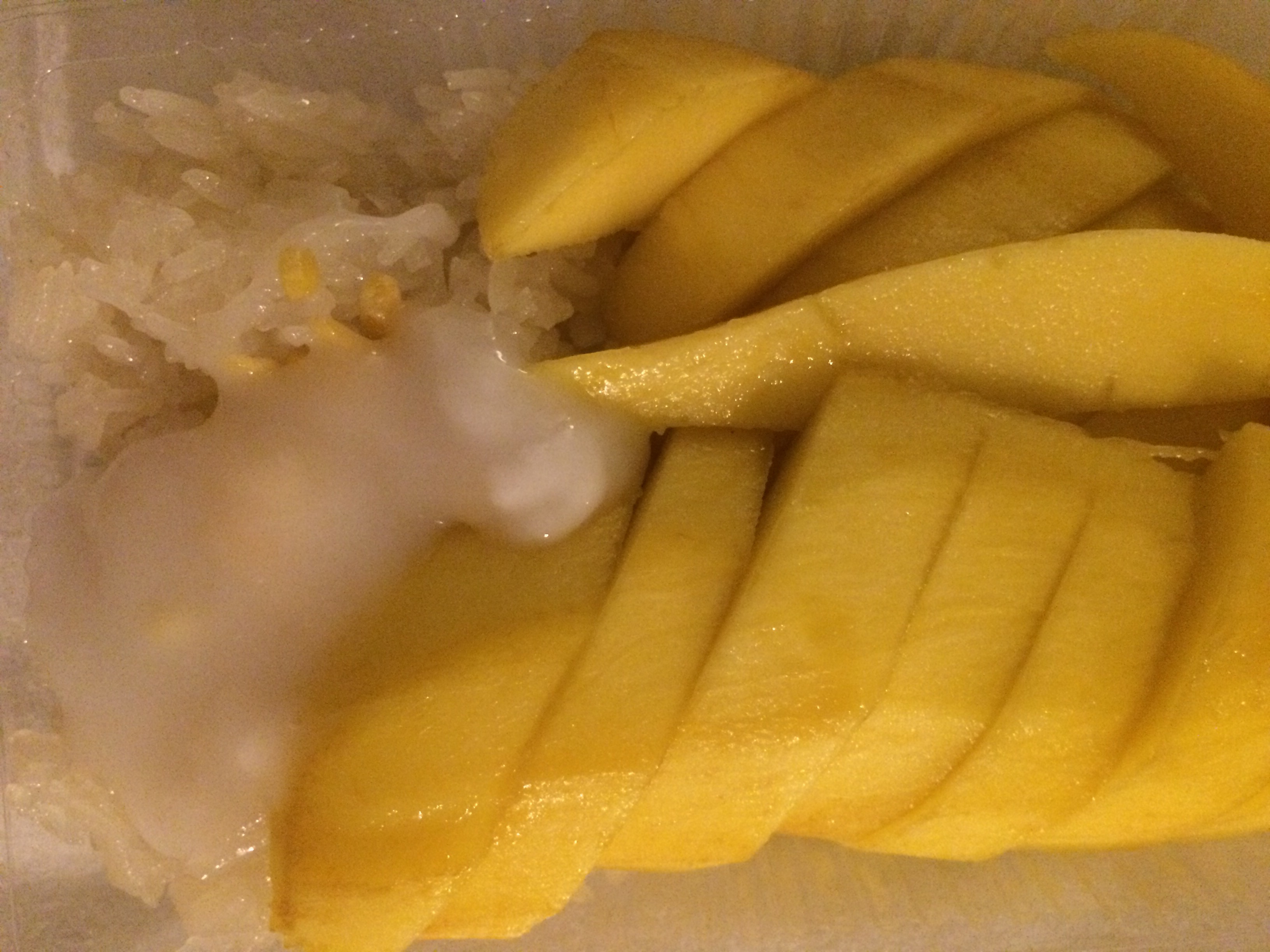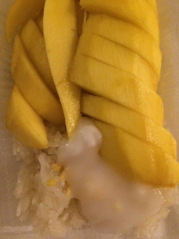 Eu paro para comprar um conjunto de “arroz pegajoso com manga” ( para tentar de acordo com o mochileiro). Mesmo que eu esteja acostumado com a mistura doce e salgada vietnamita, este prato é realmente horrível.