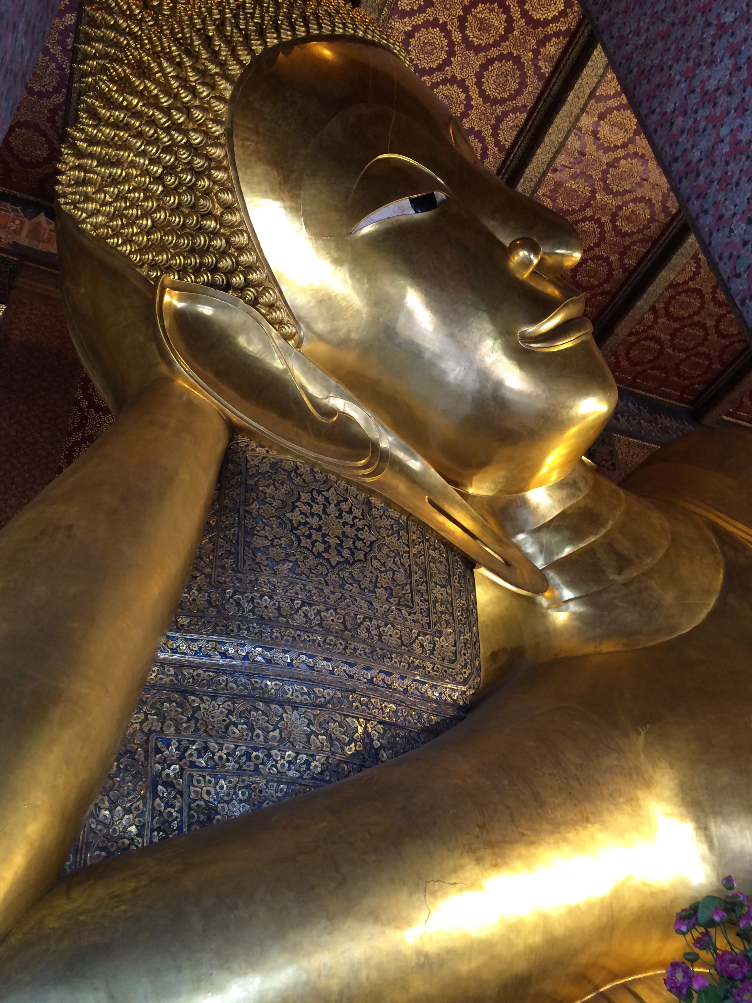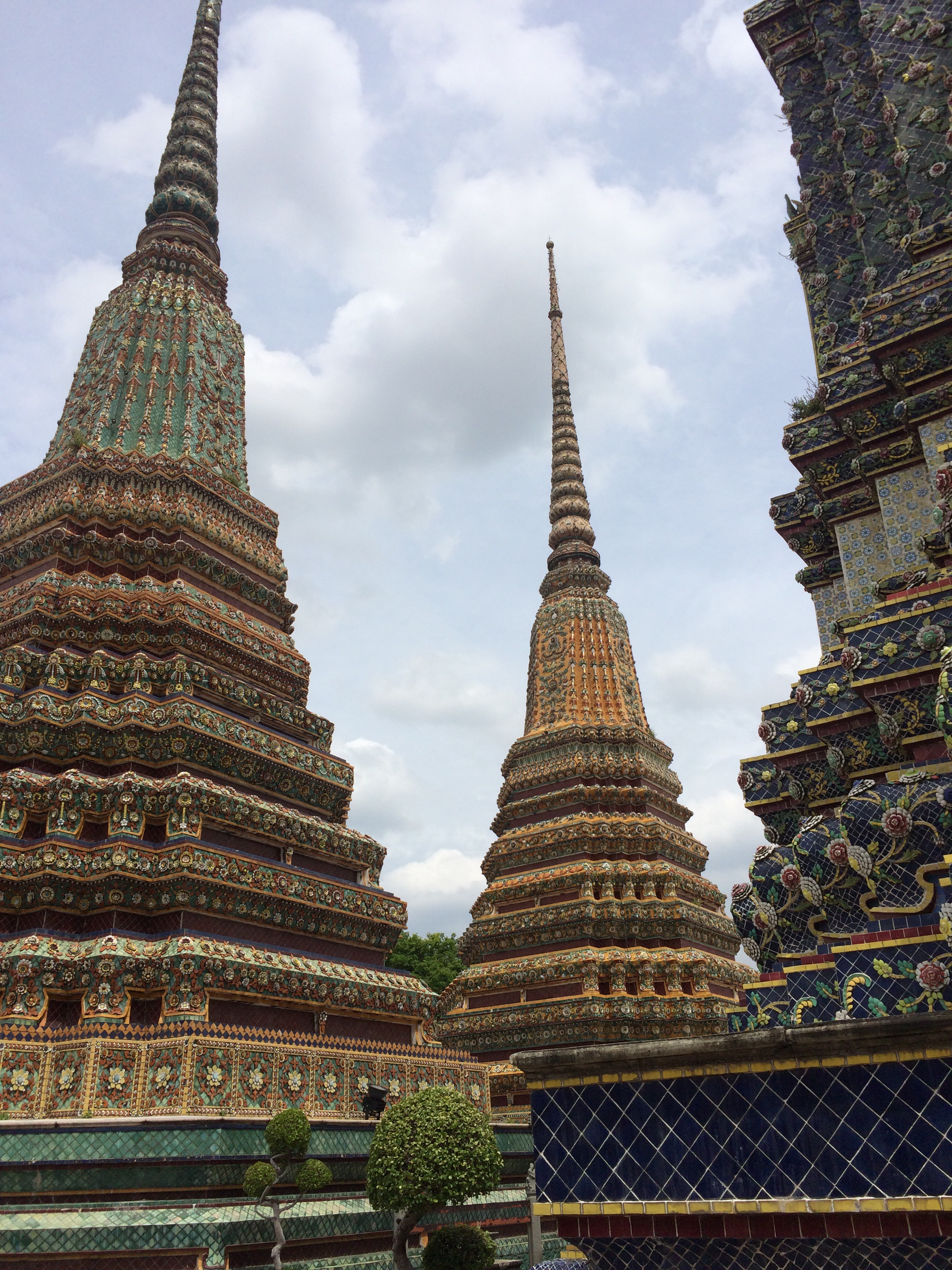 Depois vamos ao Wat Po, famoso pelo seu Buda reclinável e pela sua escola de massagem (a massagem lá é um pouco cara, 400 baht/hora). Ficamos lá durante horas a contemplar diferentes Budas.