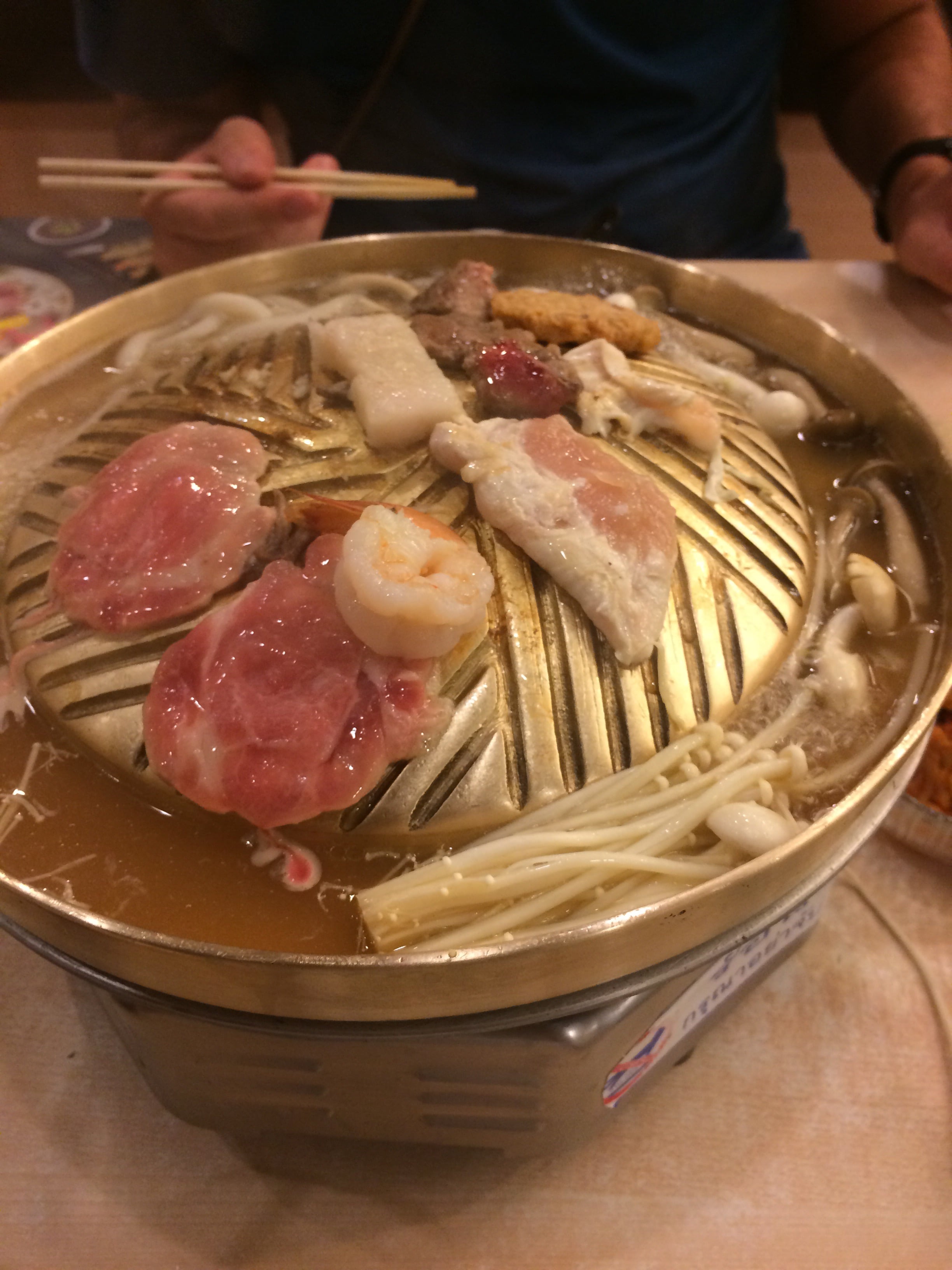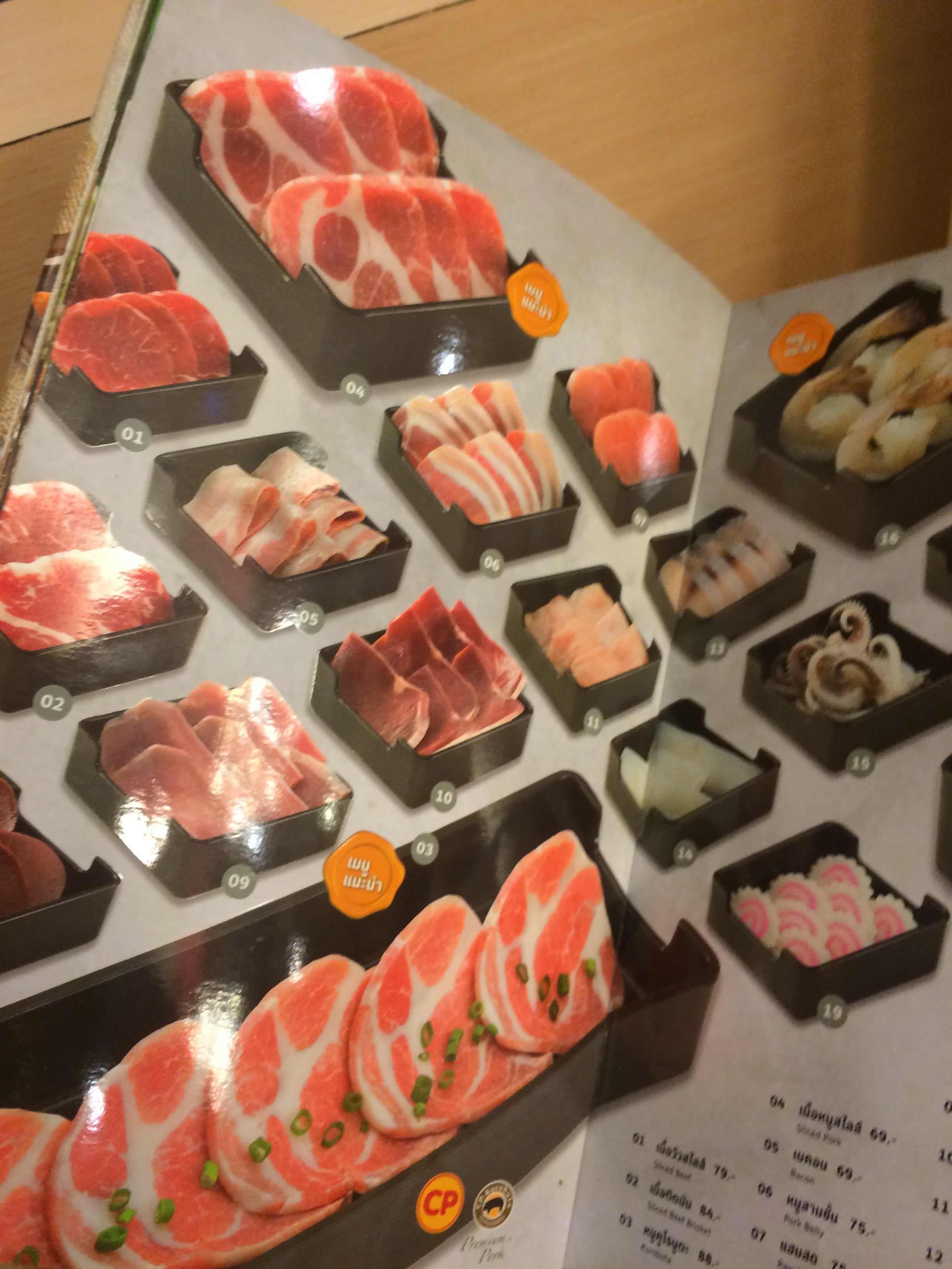 O churrasco tailandês é uma mistura de churrasco e fondue. Você tem que olear a bandeja com um pedaço de gordura e depois grelhar a carne. O sumo da carne vai dar o sabor ao caldo. O repolho dado generosamente também dará gosto. Você pode adicionar água regularmente (há um jarro, no início eu pensei que era água rs). O jarro de Coca é enorme (1 litro no mínimo). Você pode escolher conjuntos (com uma mistura de carne, legumes) ou pequenas proporções separadamente. Por 1200 baht, nós realmente nos divertimos.