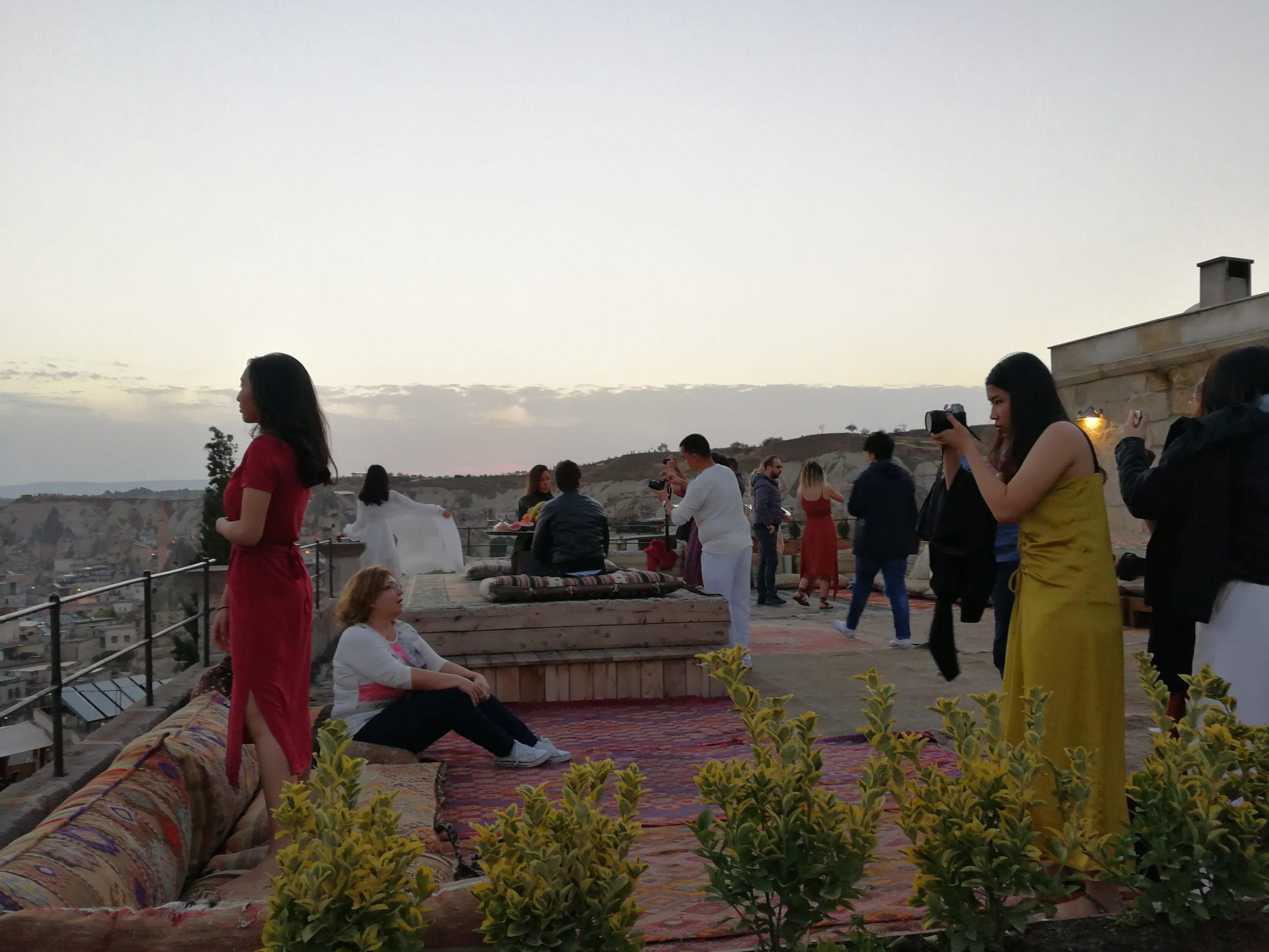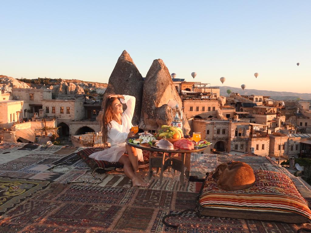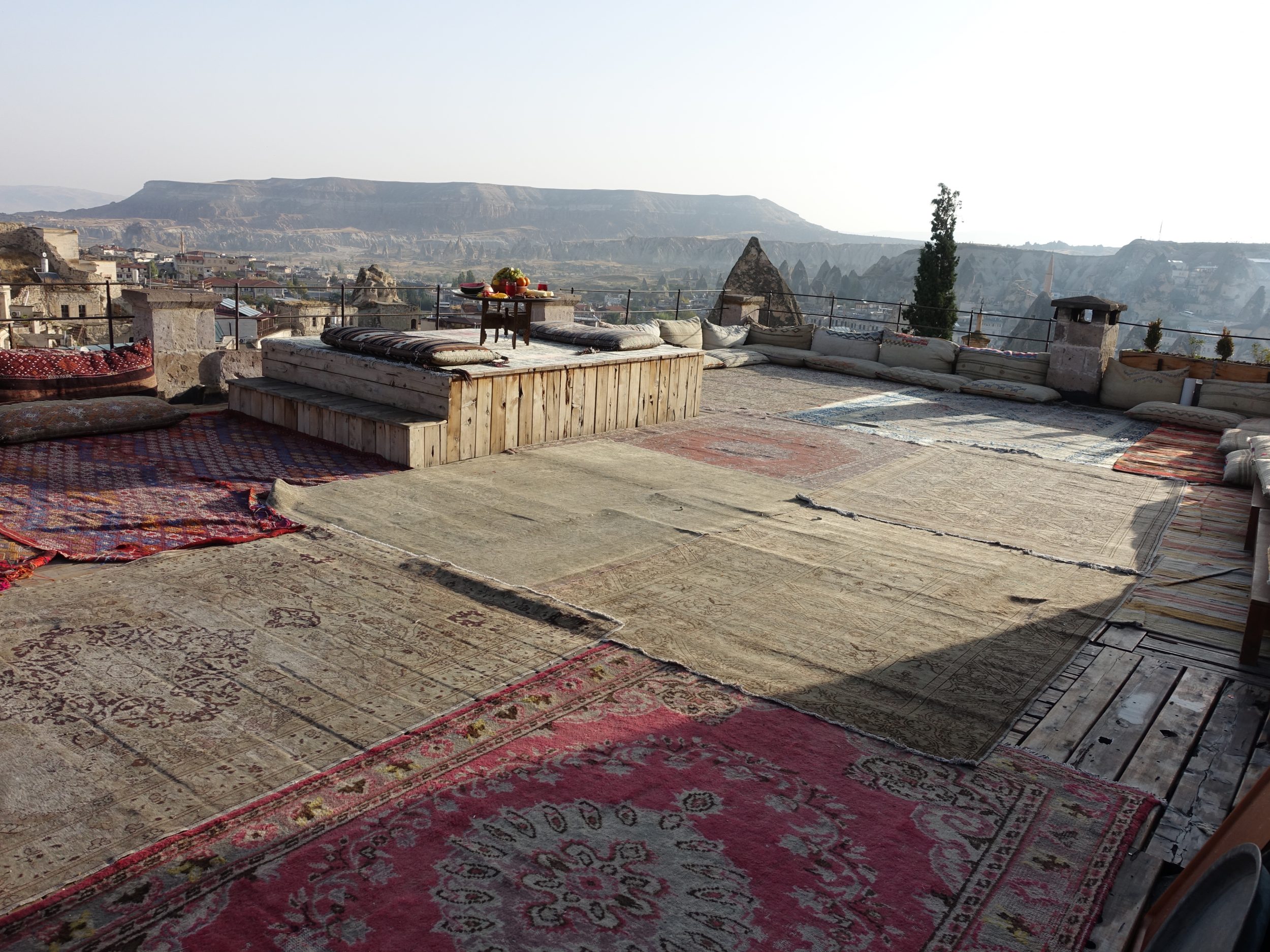 A maioria dos hotéis trogloditas da cidade tem magníficos terraços que oferecem um panorama incrível. Este é o caso do nosso hotel (Sultan Cave Suites) que, surfando no fenómeno Instagram, instala todas as manhãs uma decoração com tapetes e almofadas turcas tradicionais que permitem tirar fotografias deste tipo.