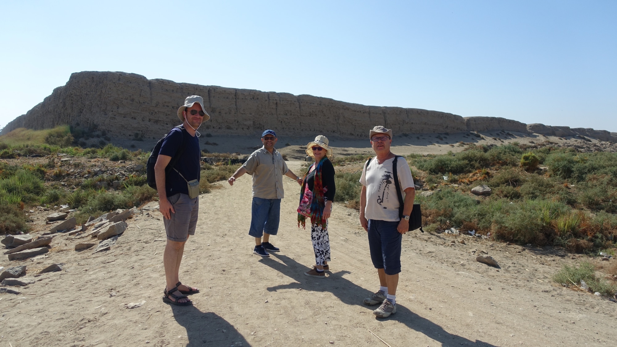 Vemos enormes muralhas em forma de onda, recordando o mito da criação do mundo (ver explicação abaixo). Dentro destas muralhas há uma cidade antiga mas está fechada aos turistas. foto (da esquerda para a direita) : JB, nosso guia e nossos companheiros de viagem, dois aposentados super simpáticos de Nice, que são apaixonados pelo Egito. Temos muita sorte em viajar com eles porque os três dão uma energia e uma aura incríveis