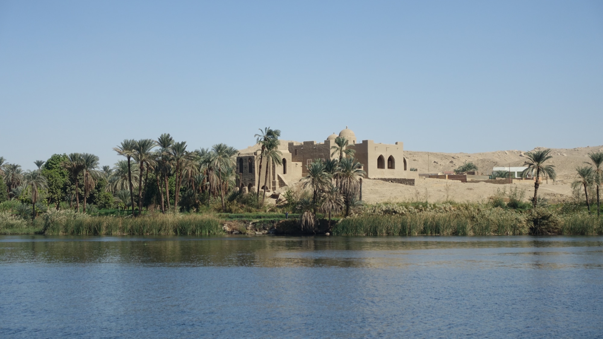 Estamos admirando a paisagem da ponte quando o nosso guia nos mostra uma casa MAGNIFICENT na margem do Nilo. Pertence à missão belga que trabalha em El Kab. Foi projetado pelo arquiteto Clarke Somers, que também fez a casa do Carter perto do Vale dos Reis. É por isso que você tem que estar na ponte com o guia o tempo todo, caso contrário você arrisca pepitas como esta