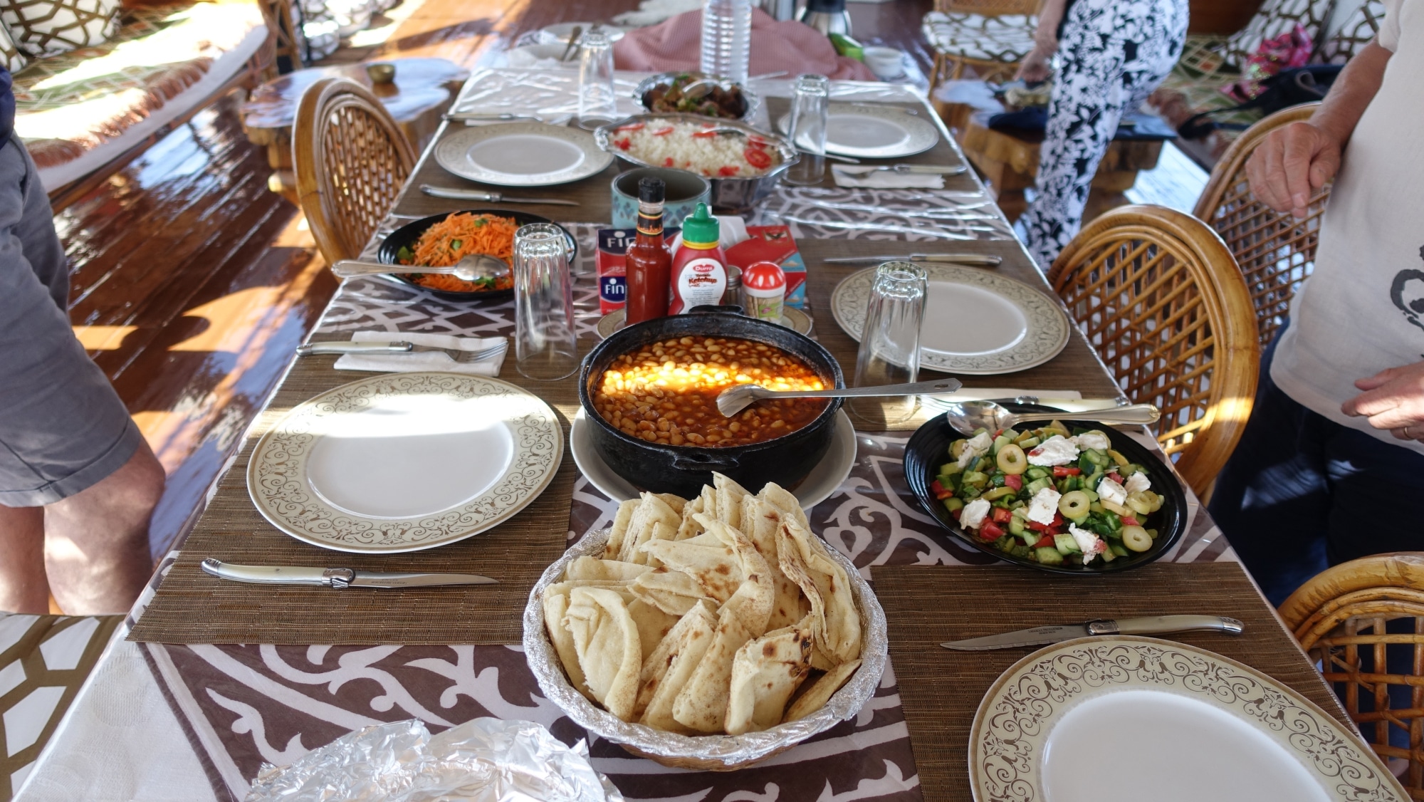 Almoçamos no barco (há sempre uma pequena sopa no início com miaaam de limão) e uma grande quantidade de pratos + sobremesa. É uma delícia!