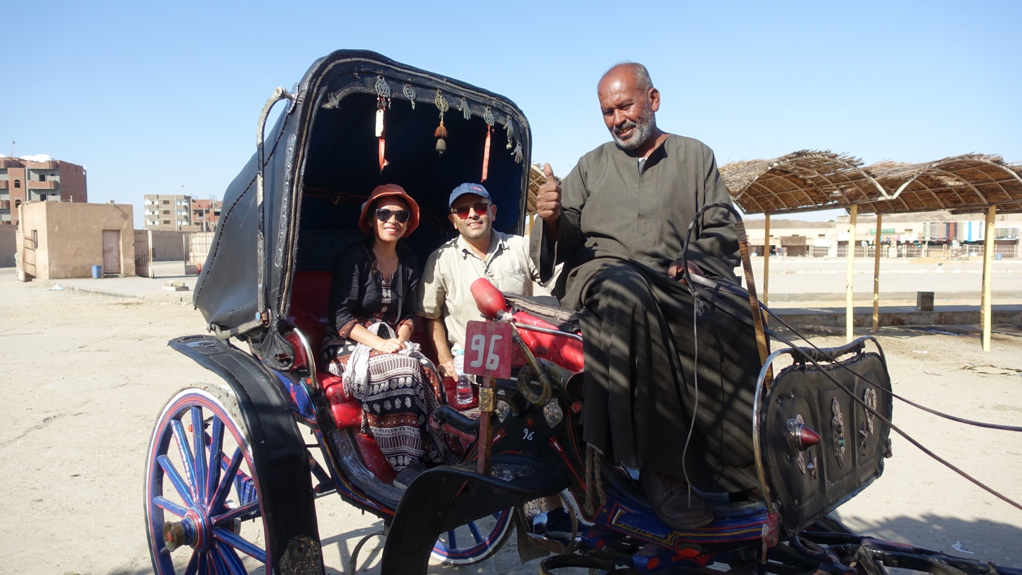 Pegamos uma carruagem puxada por cavalos (já nos espera no cais – que organização!) para ir ao templo (200 libras de ida e volta, mas já incluída no nosso passeio). Na foto, estou com o nosso guia Bassem