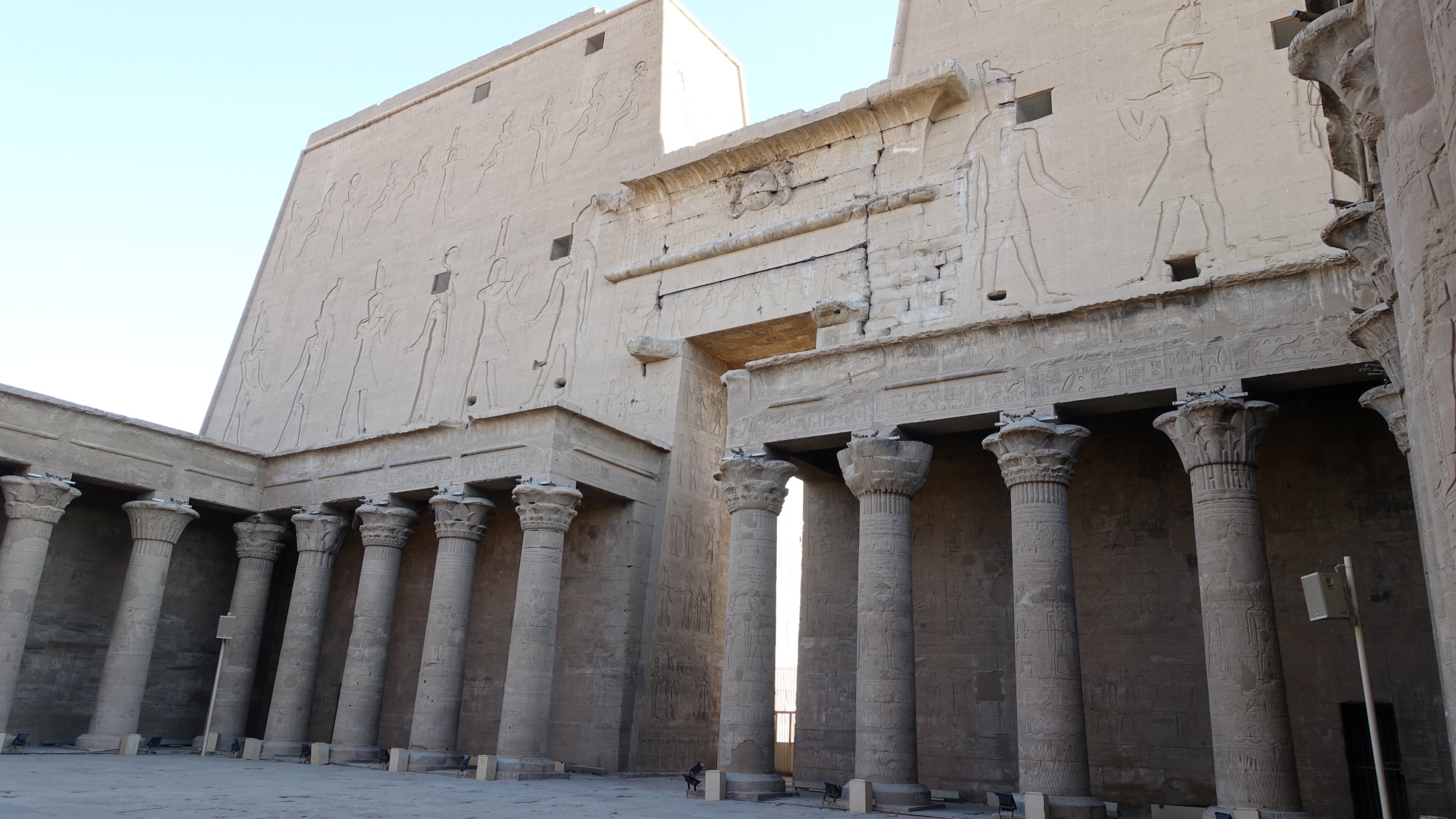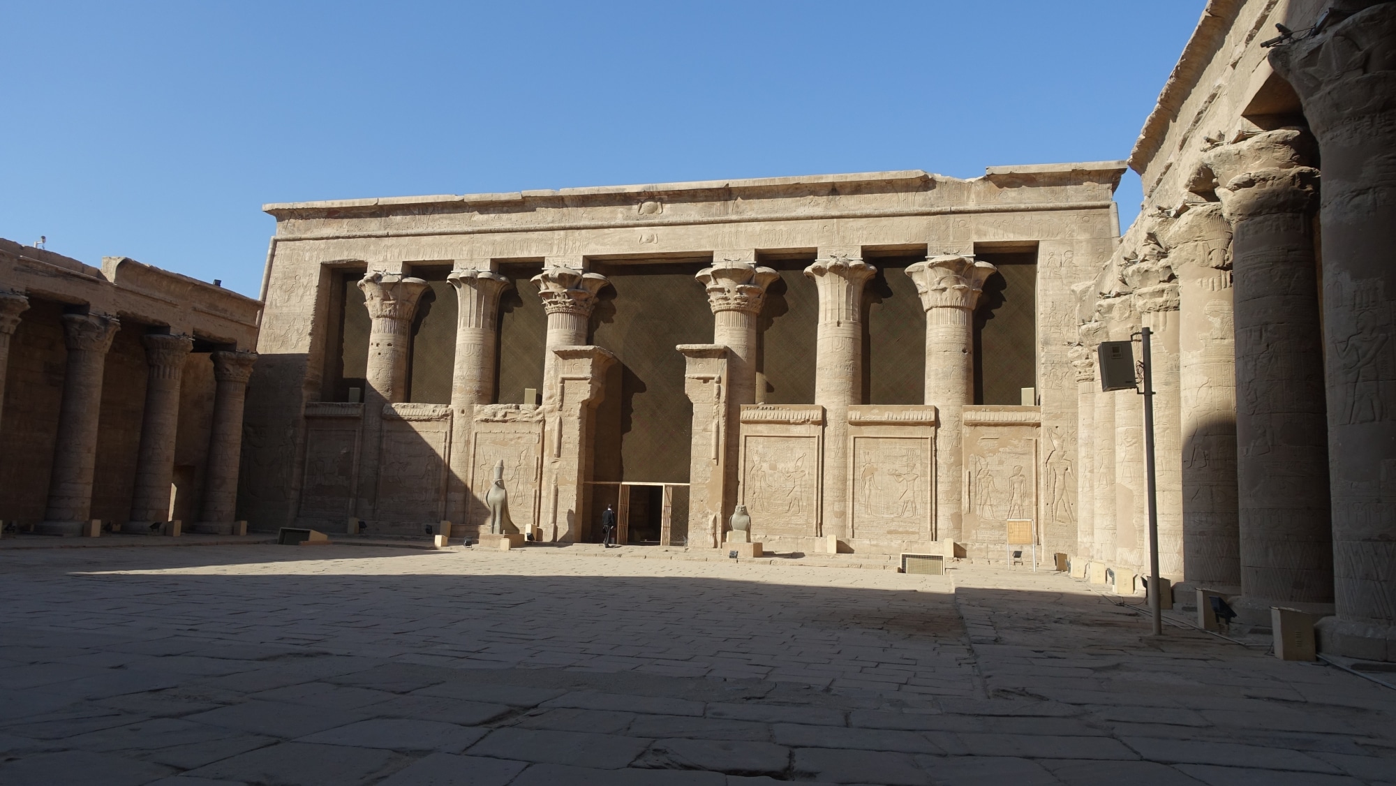 Saímos pelo grande pátio, está a ficar lotado no templo. Somos tão privilegiados por termos tido um templo tão bonito e movimentado só para nós por um bom tempo. Estou impressionado com a beleza deste templo. E graças ao seu excelente estado de conservação, dá-nos uma melhor compreensão da estrutura típica de um templo egípcio e uma melhor imagem do templo karnak e do templo Luxor no seu estado original