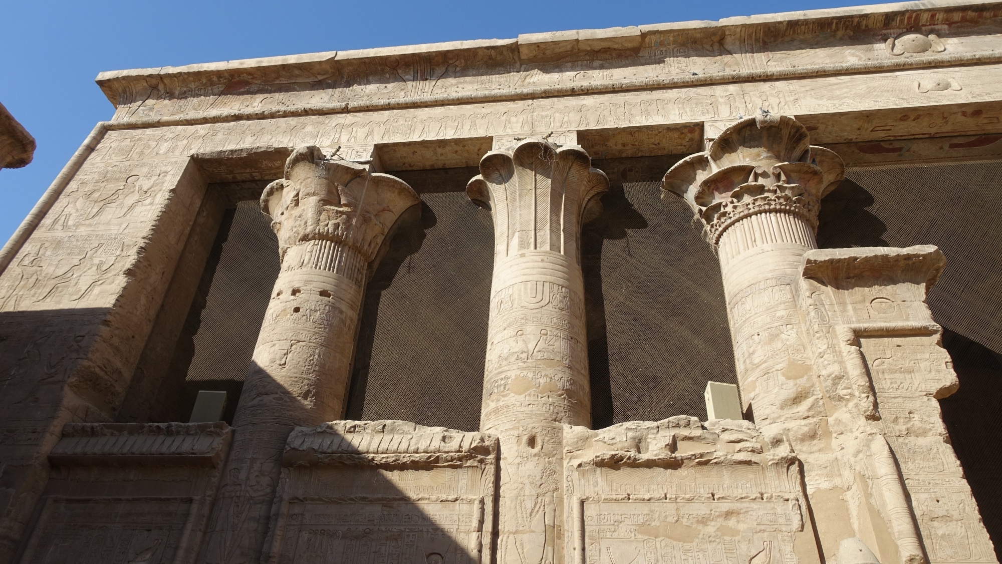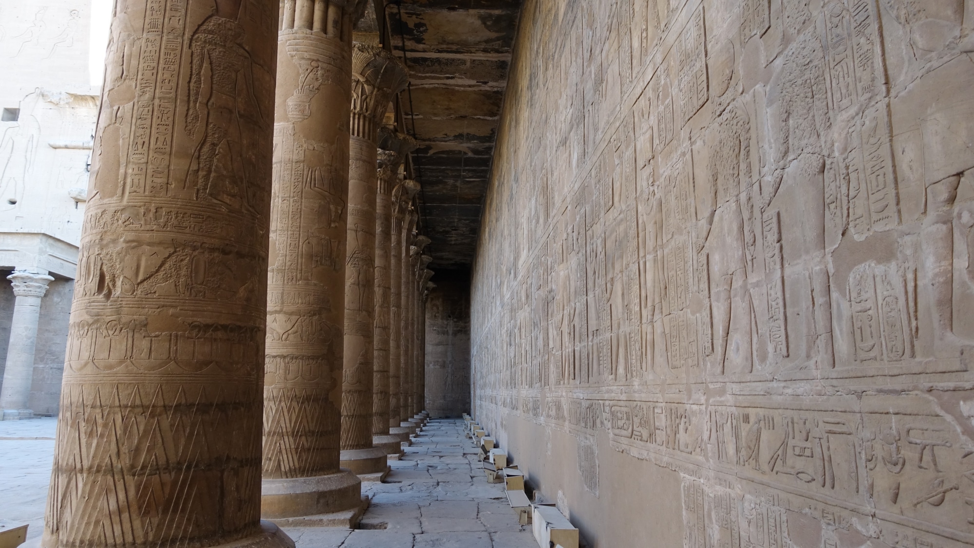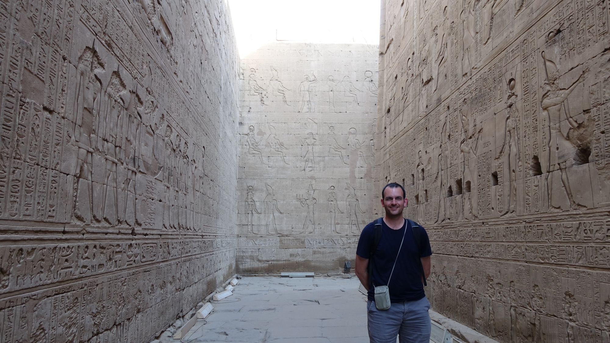 E aqui está o templo de Edfu, dedicado ao deus falcão Horus. Olha, não há ninguém por perto! O luxo máximo! Veja como os padrões e desenhos são enormes. E acima de tudo, bem preservado! Este templo foi preservado graças às tempestades de areia que o enterraram sob vários metros de areia