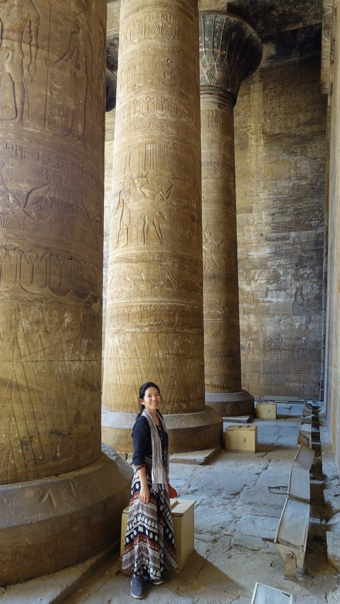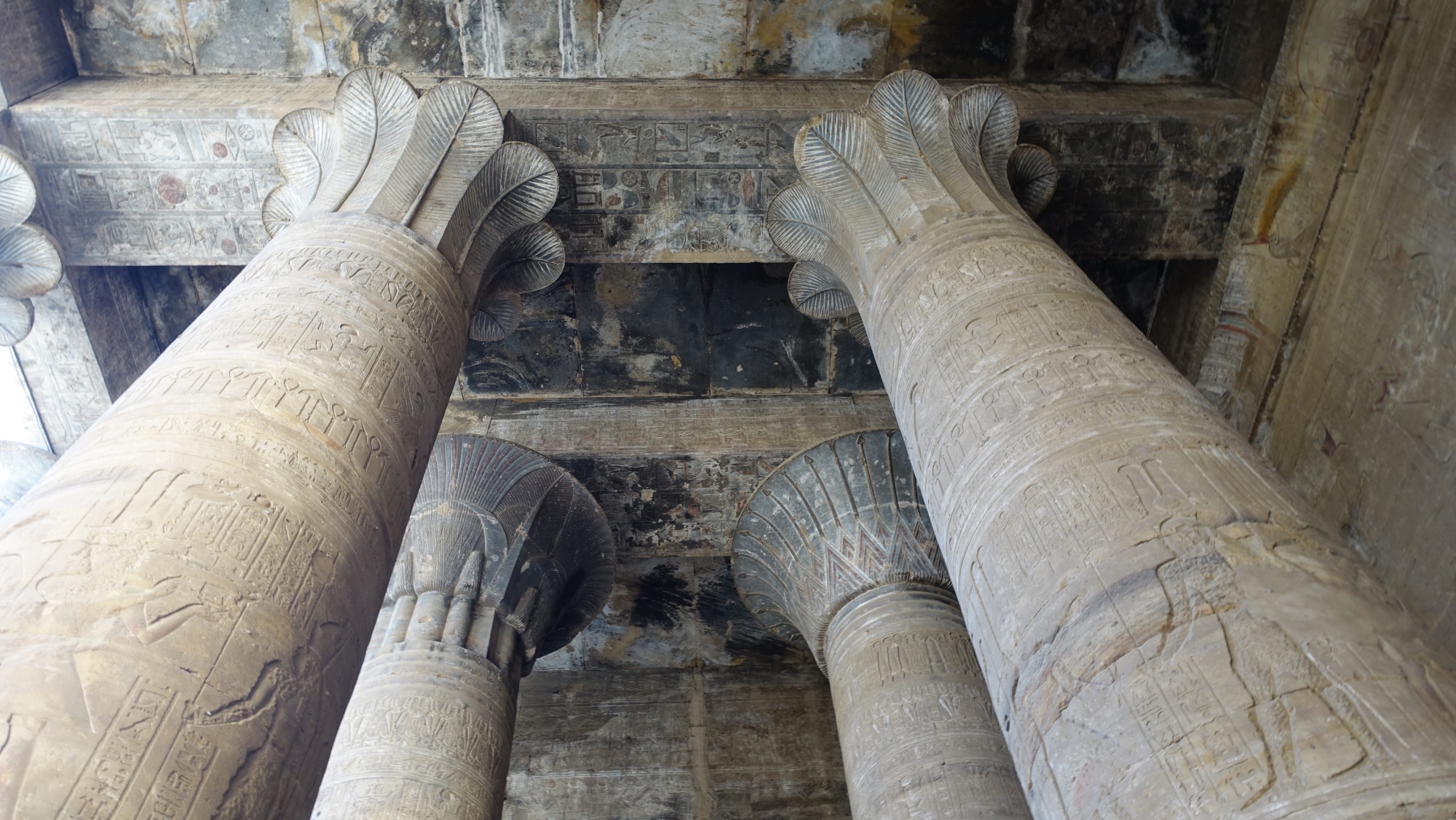 E lá dentro, ohlala, é incrível! Enormes colunas nos esperam, com um telhado (infelizmente todos negros por causa dos Copts que queriam danificar o local)