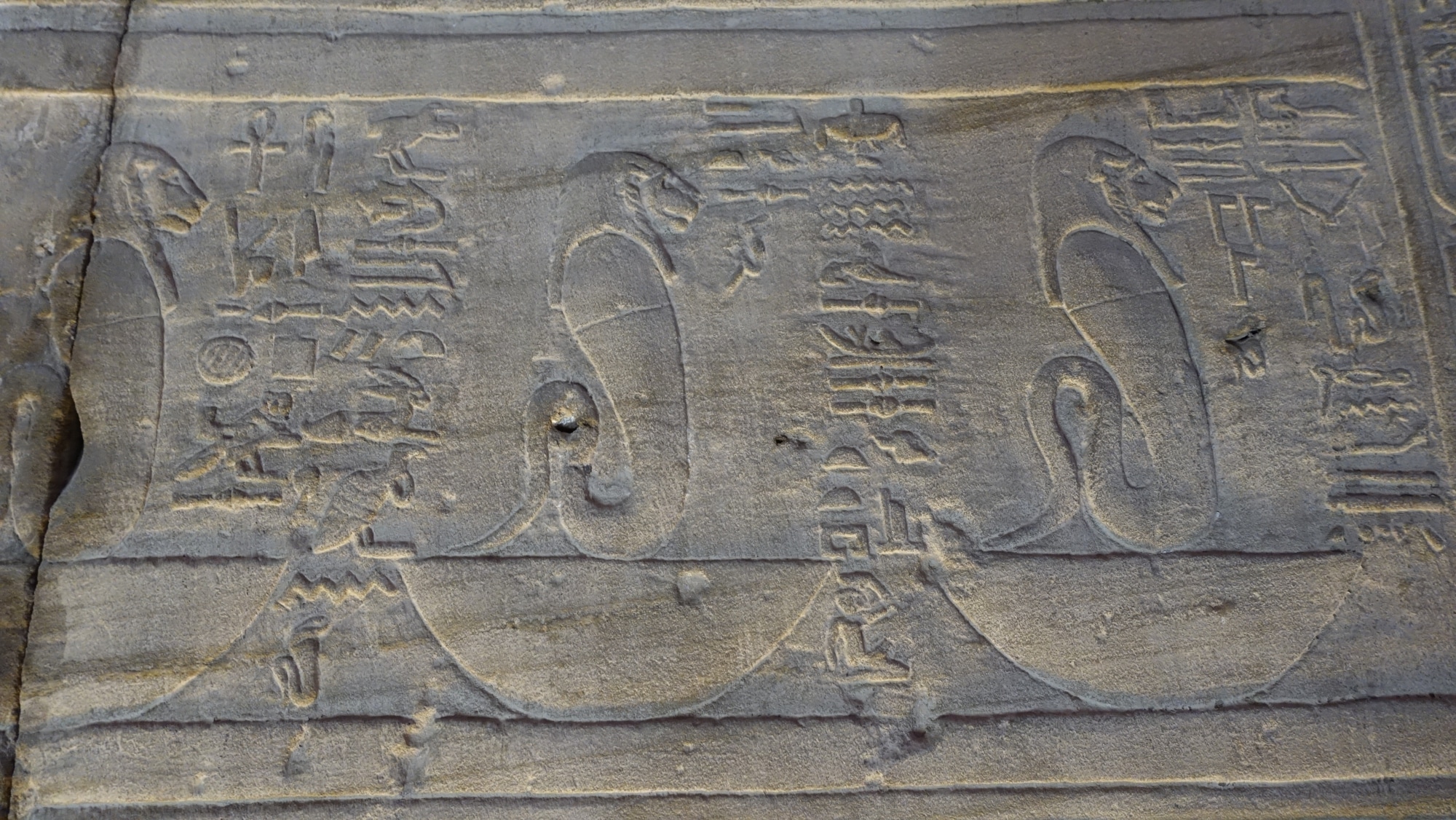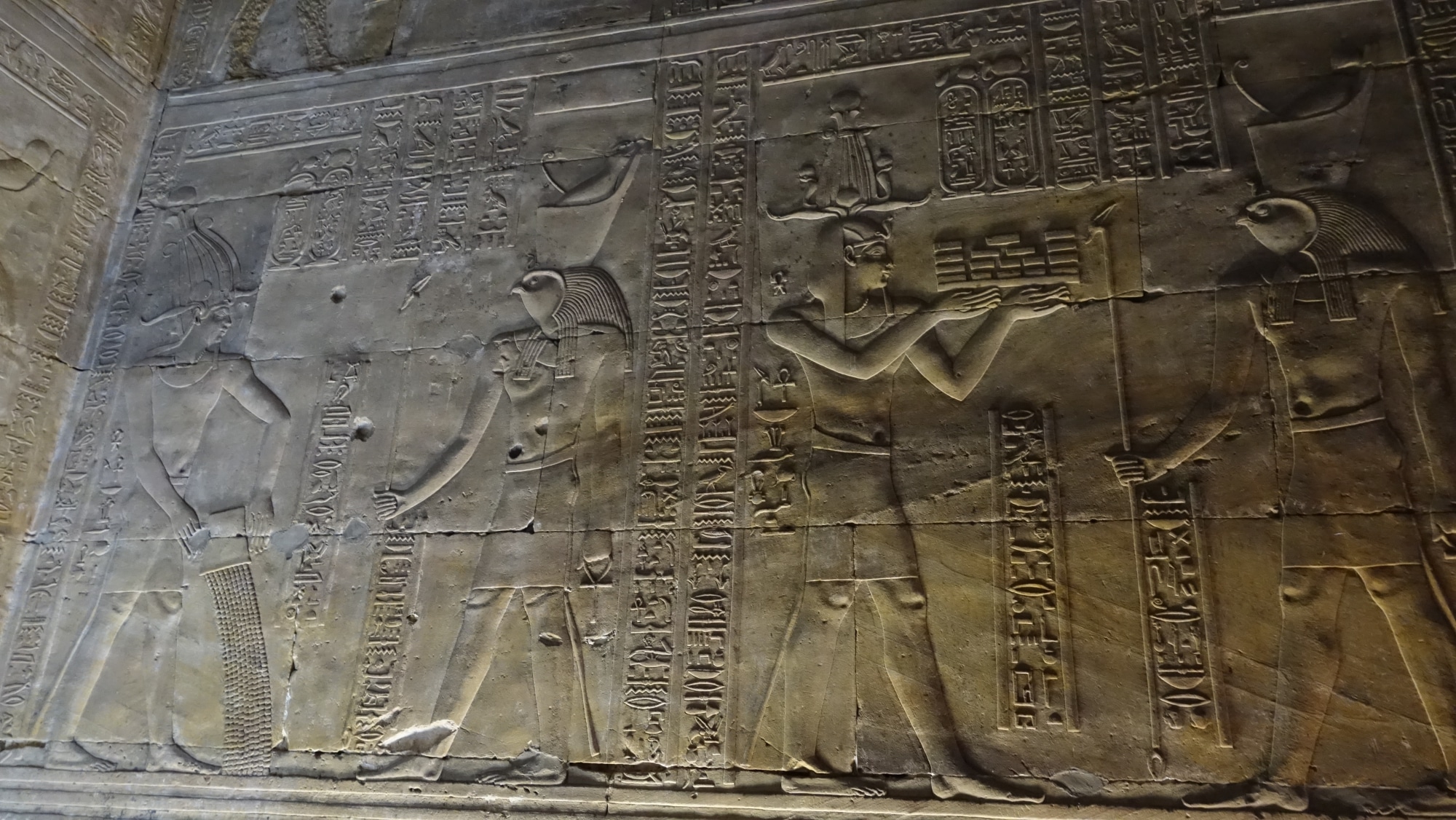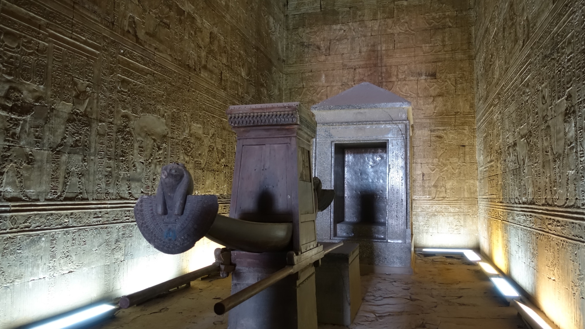 Dentro, vemos cenas do Faraó pedindo a permissão de Deus para construir um templo e a validação de sua localização, até as ofertas aos Deuses, o barco carregado pelos sacerdotes… algumas cenas ecoam as cenas vistas no templo karnak. Muitas representações do faraó foram marteladas pelos coptas, que queriam vingança. Eles martelaram tanto que a certa altura ficaram fartos e preferiram encobrir os motivos. Então, graças à areia que escondia uma parte + a preguiça dos Copts, alguns desenhos não foram martelados. Phew!