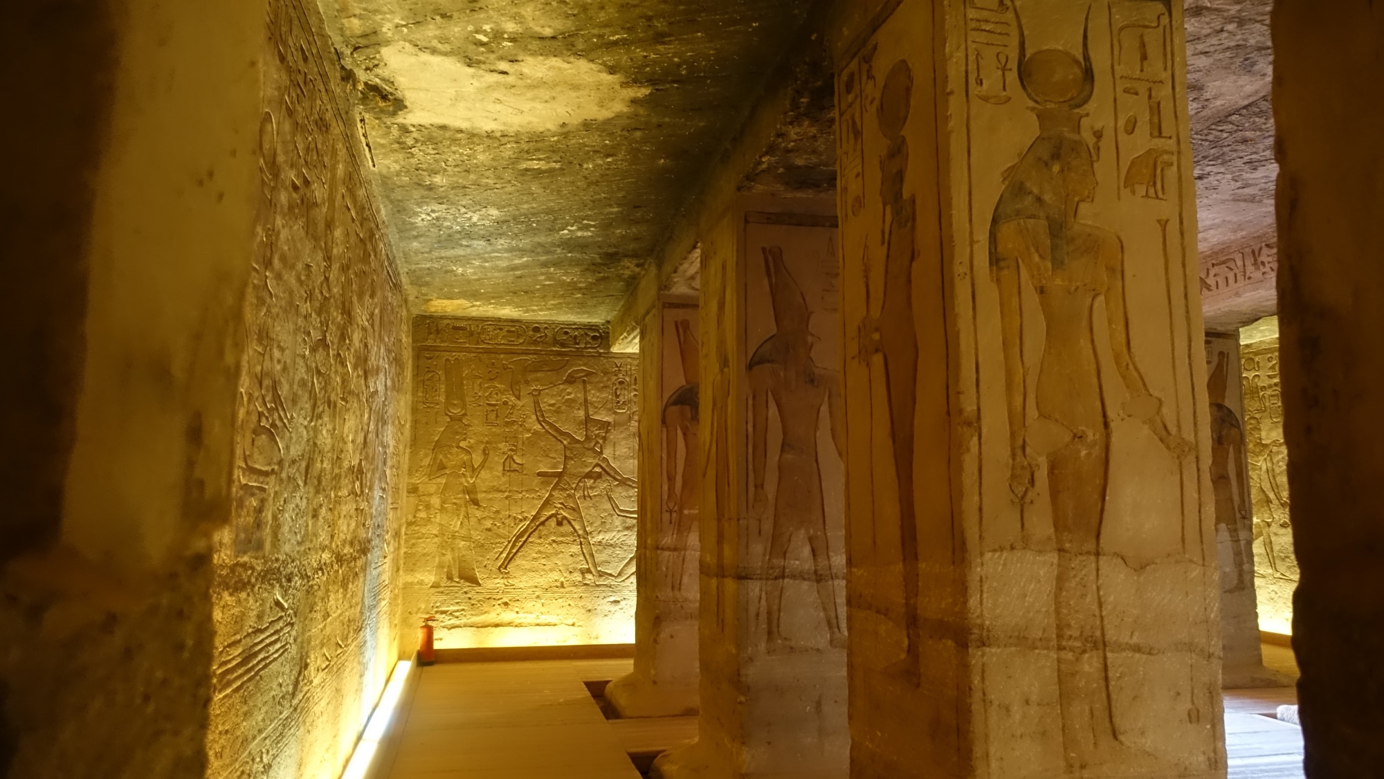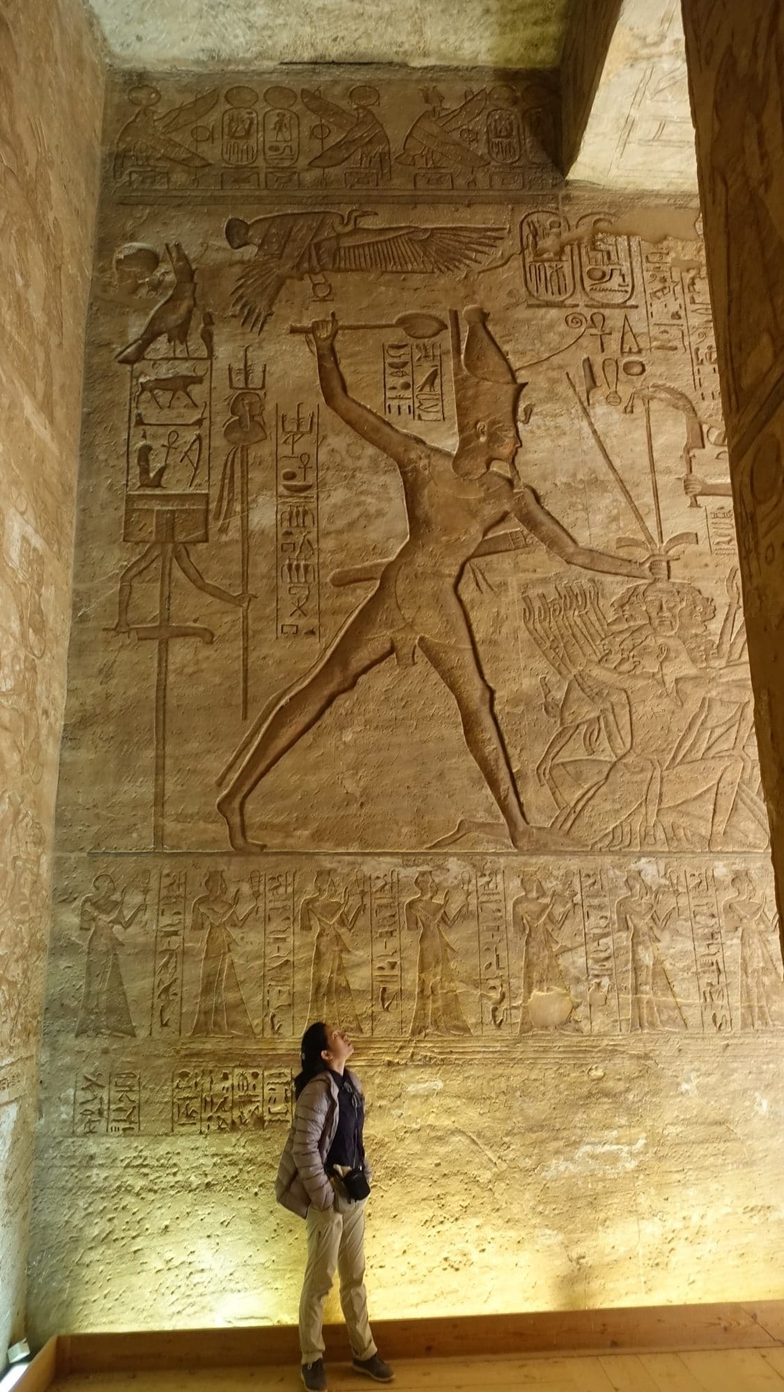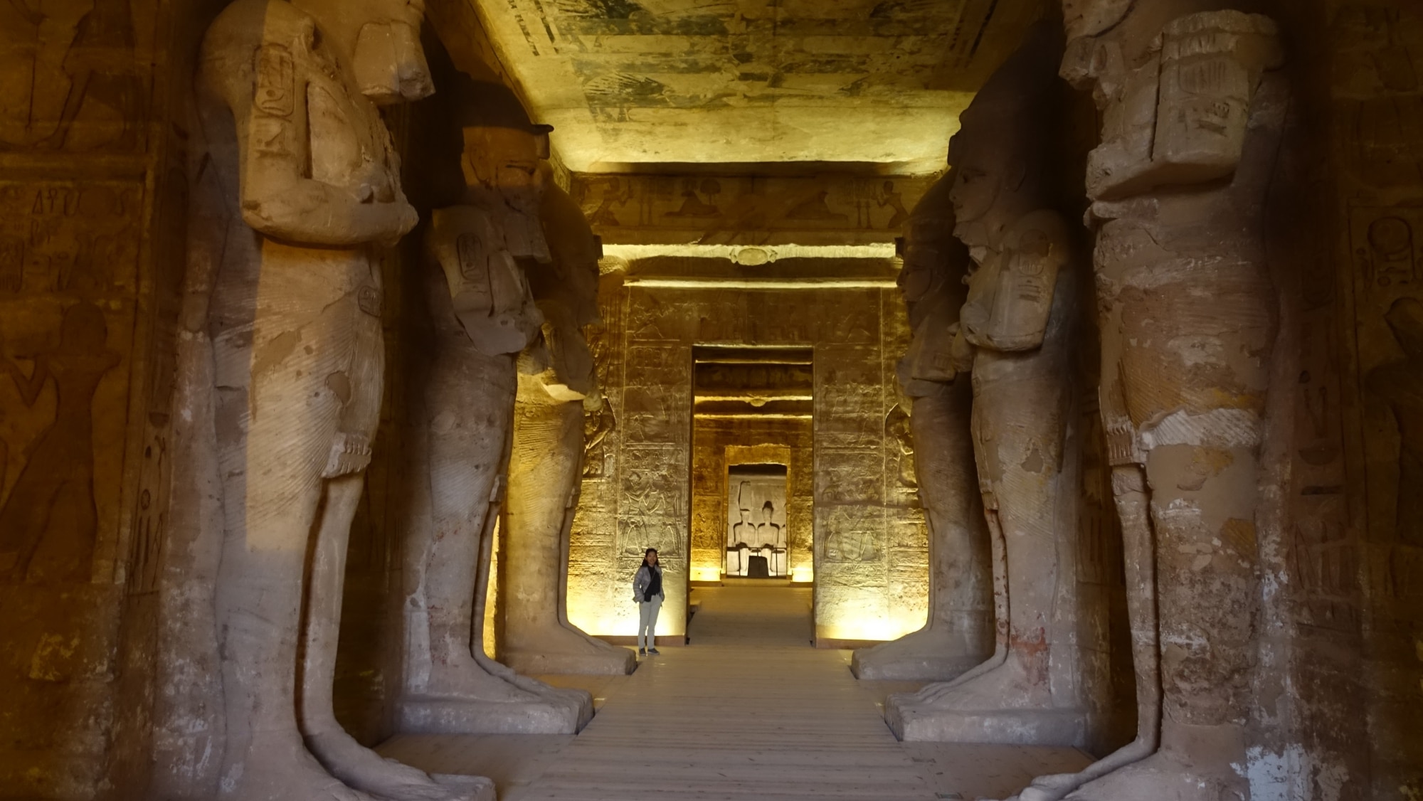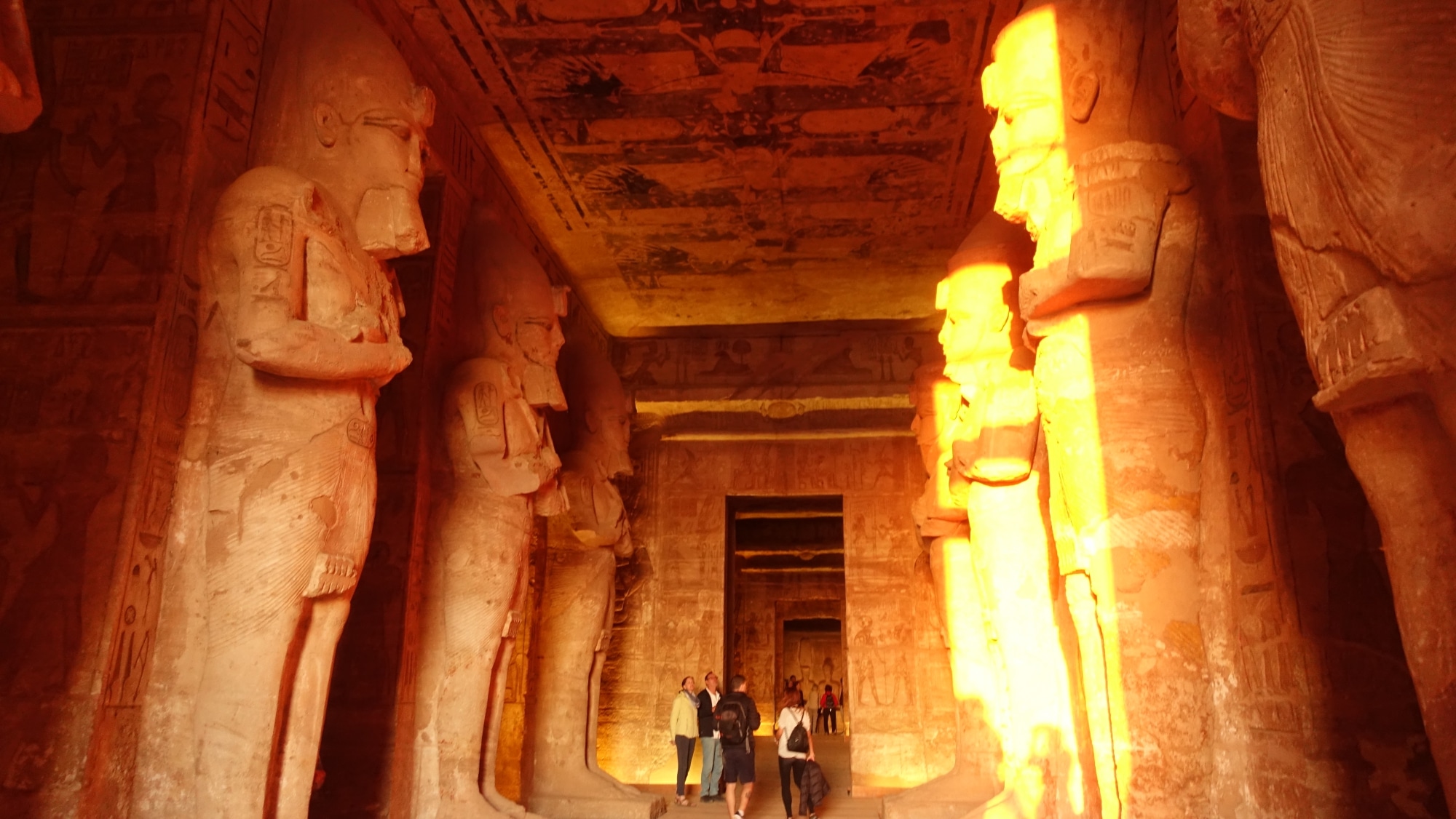 Visitamos o interior do templo de Ramsés II, silenciosamente, sem uma única sombra, porque todos estão ocupados esperando o nascer do sol do lado de fora do templo. O interior é iluminado por luz artificial para que possamos ver os relevos muito, muito bem