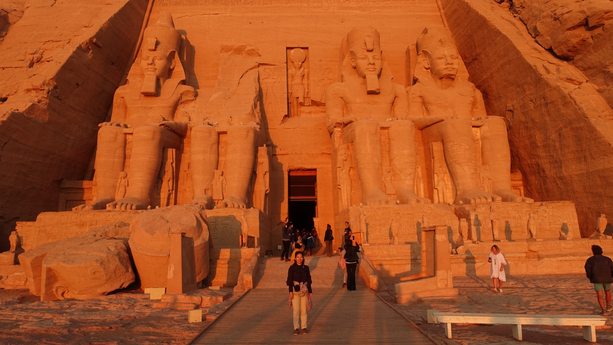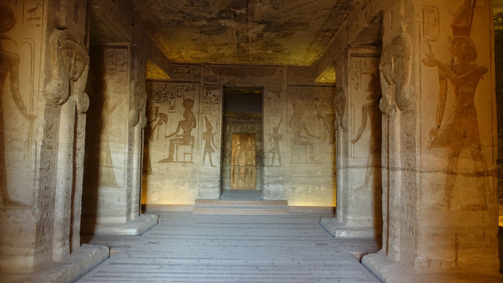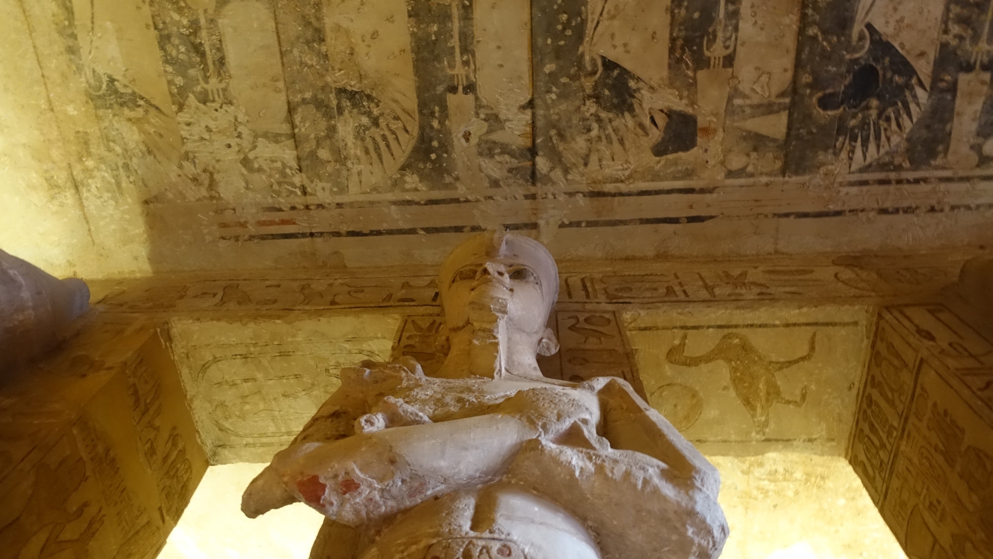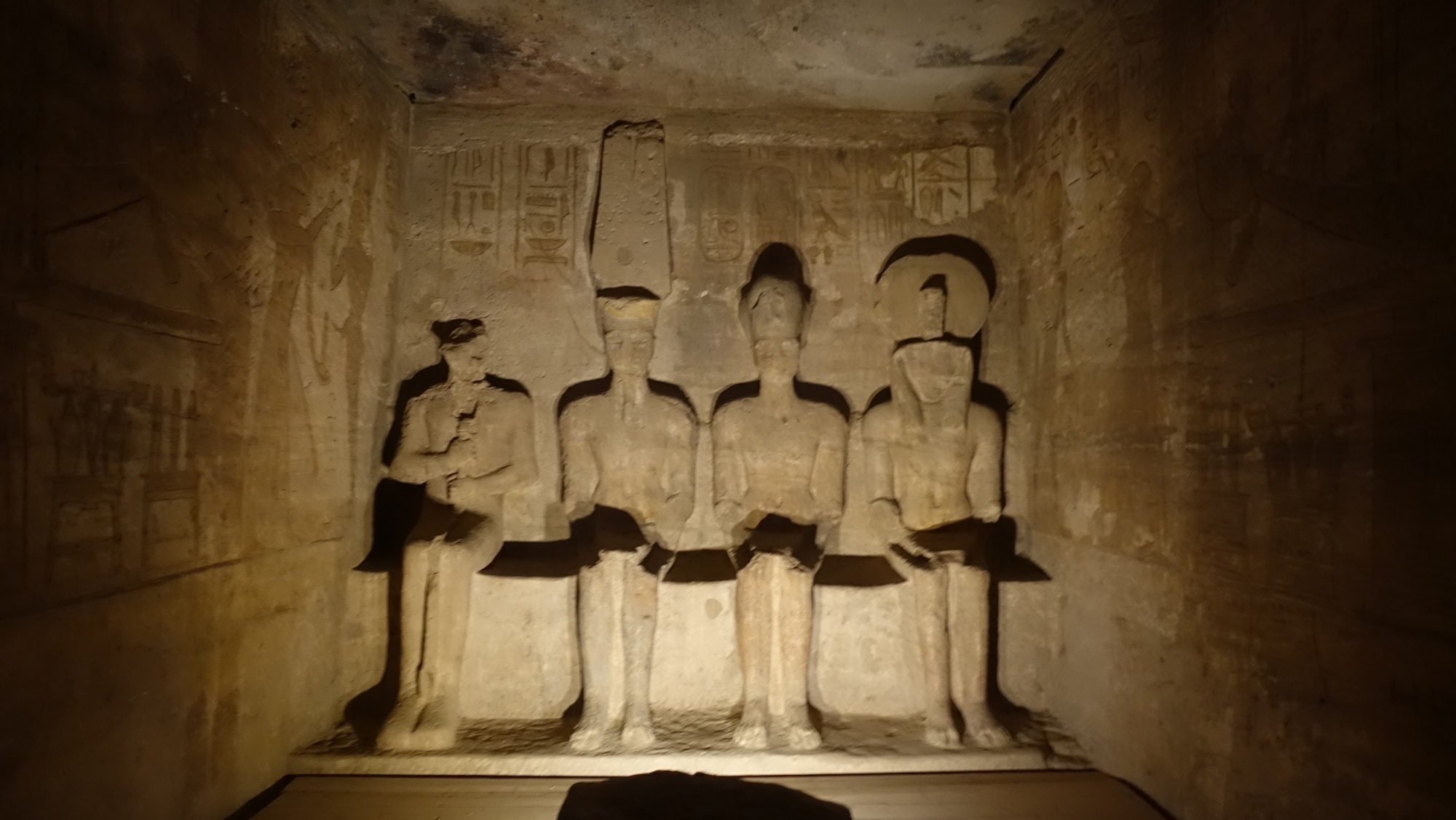 Visitamos o interior do templo de Ramsés II, silenciosamente, sem uma única sombra, porque todos estão ocupados esperando o nascer do sol do lado de fora do templo. O interior é iluminado por luz artificial para que possamos ver os relevos muito, muito bem