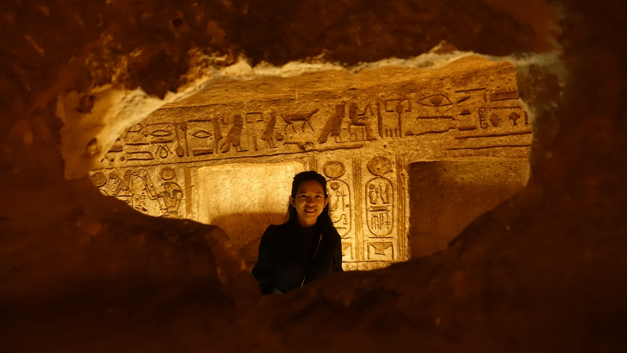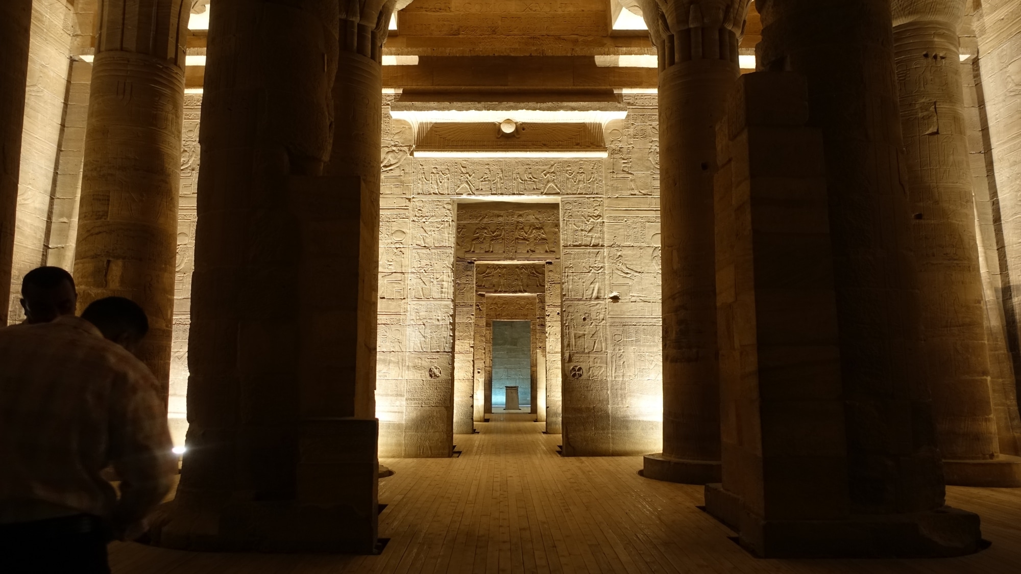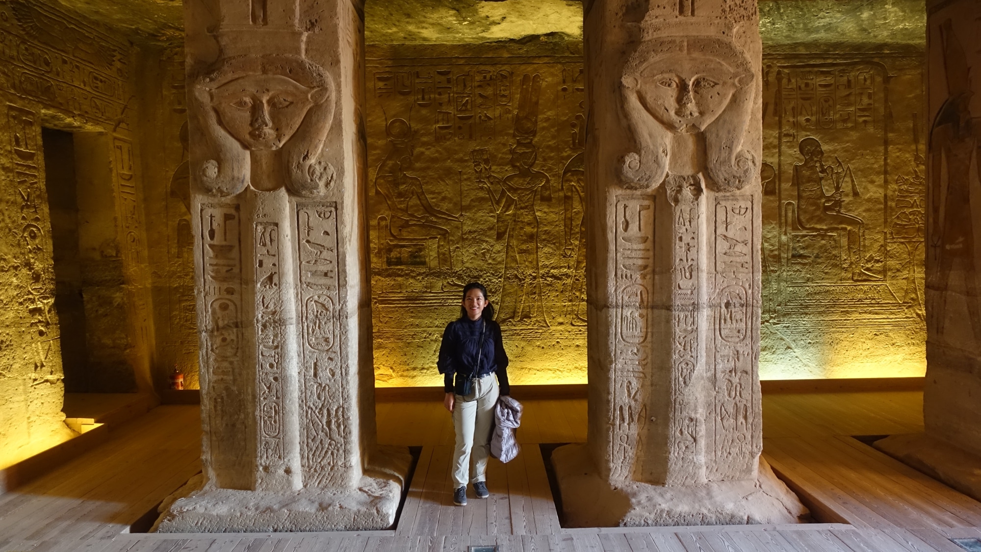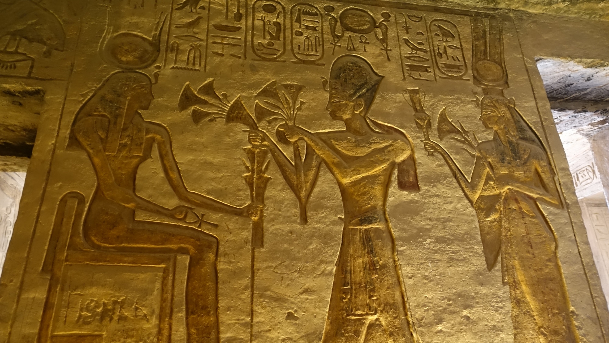 Visitamos o interior do templo de Ramsés II, silenciosamente, sem uma única sombra, porque todos estão ocupados esperando o nascer do sol do lado de fora do templo. O interior é iluminado por luz artificial para que possamos ver os relevos muito, muito bem