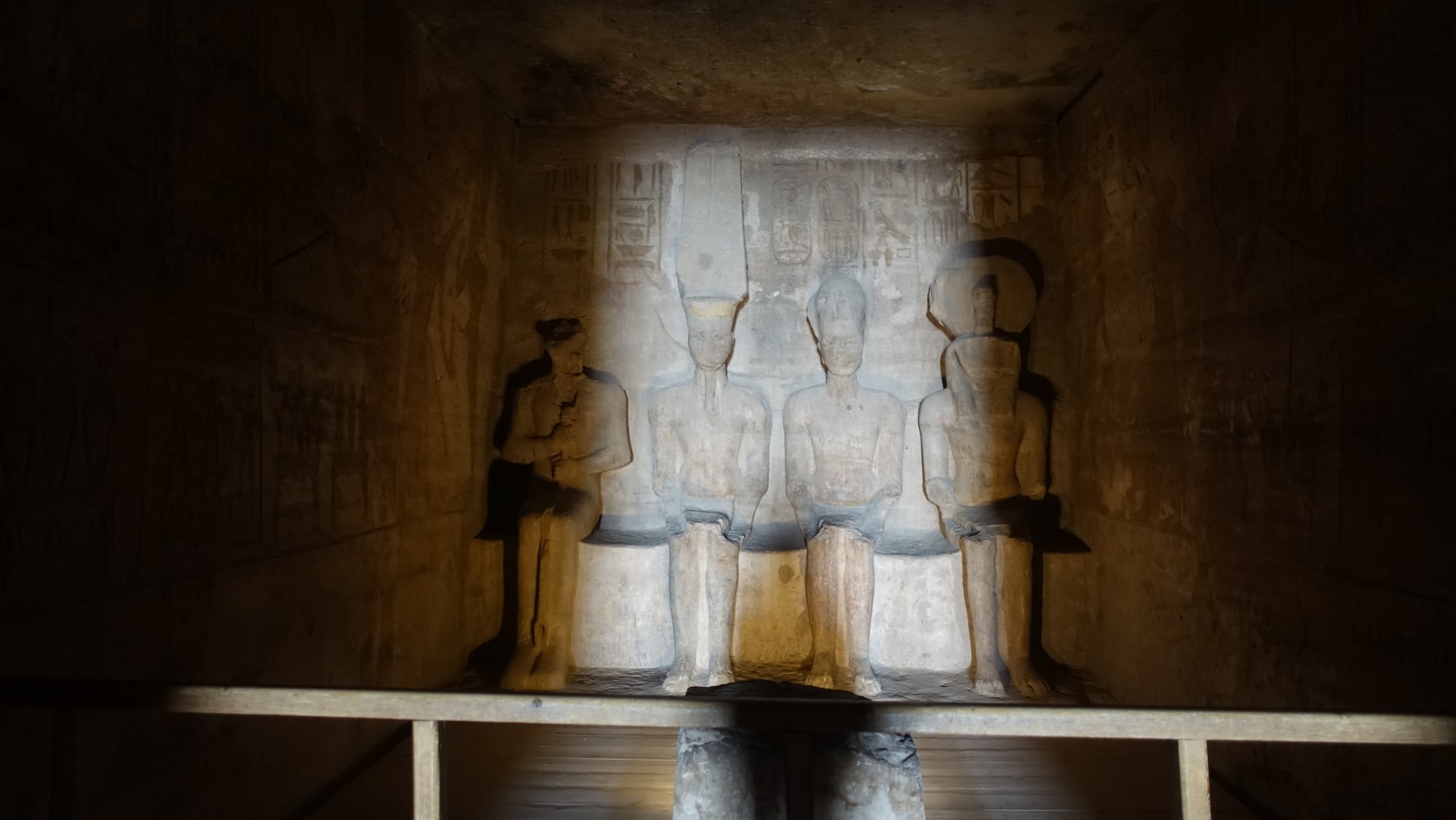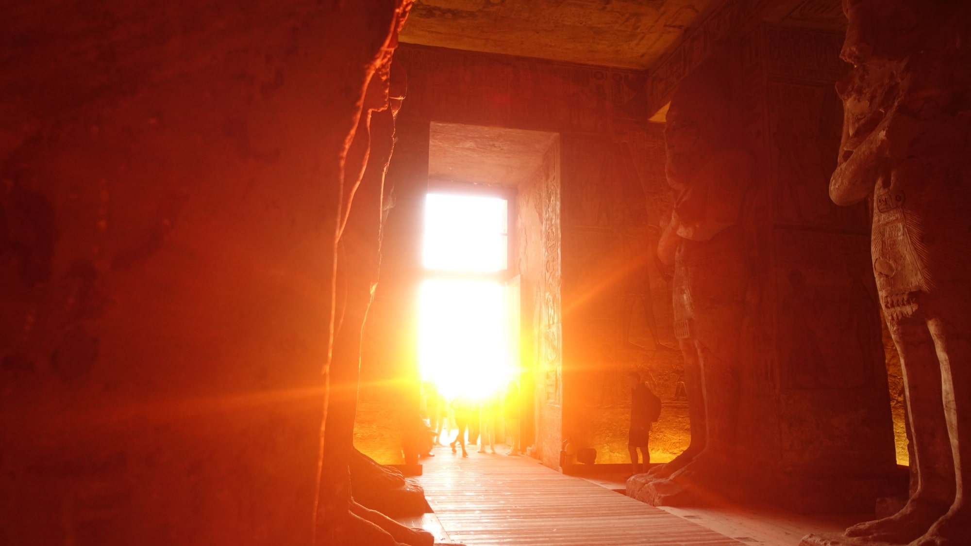 O sol entra no templo, e é mágico! Uma luz vermelha veste Ramsés II na primeira câmara. Mas aquela luz vermelha não vai além da Primeira Câmara. Estamos no dia 17 de Novembro