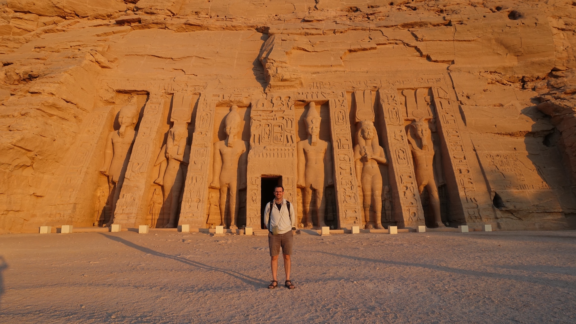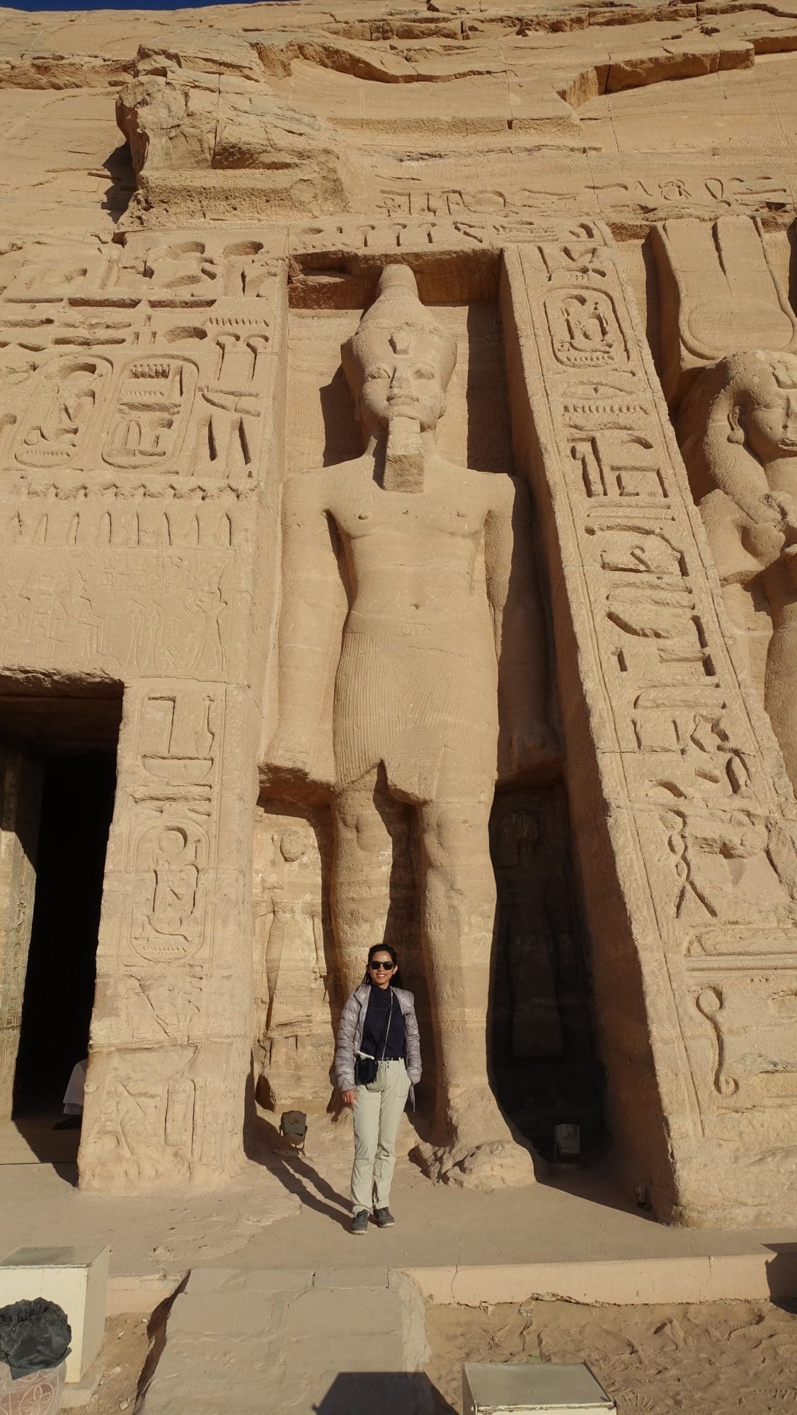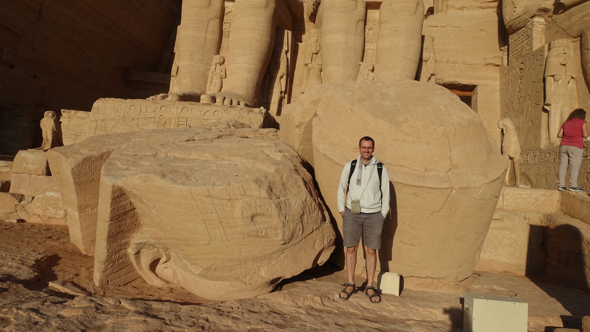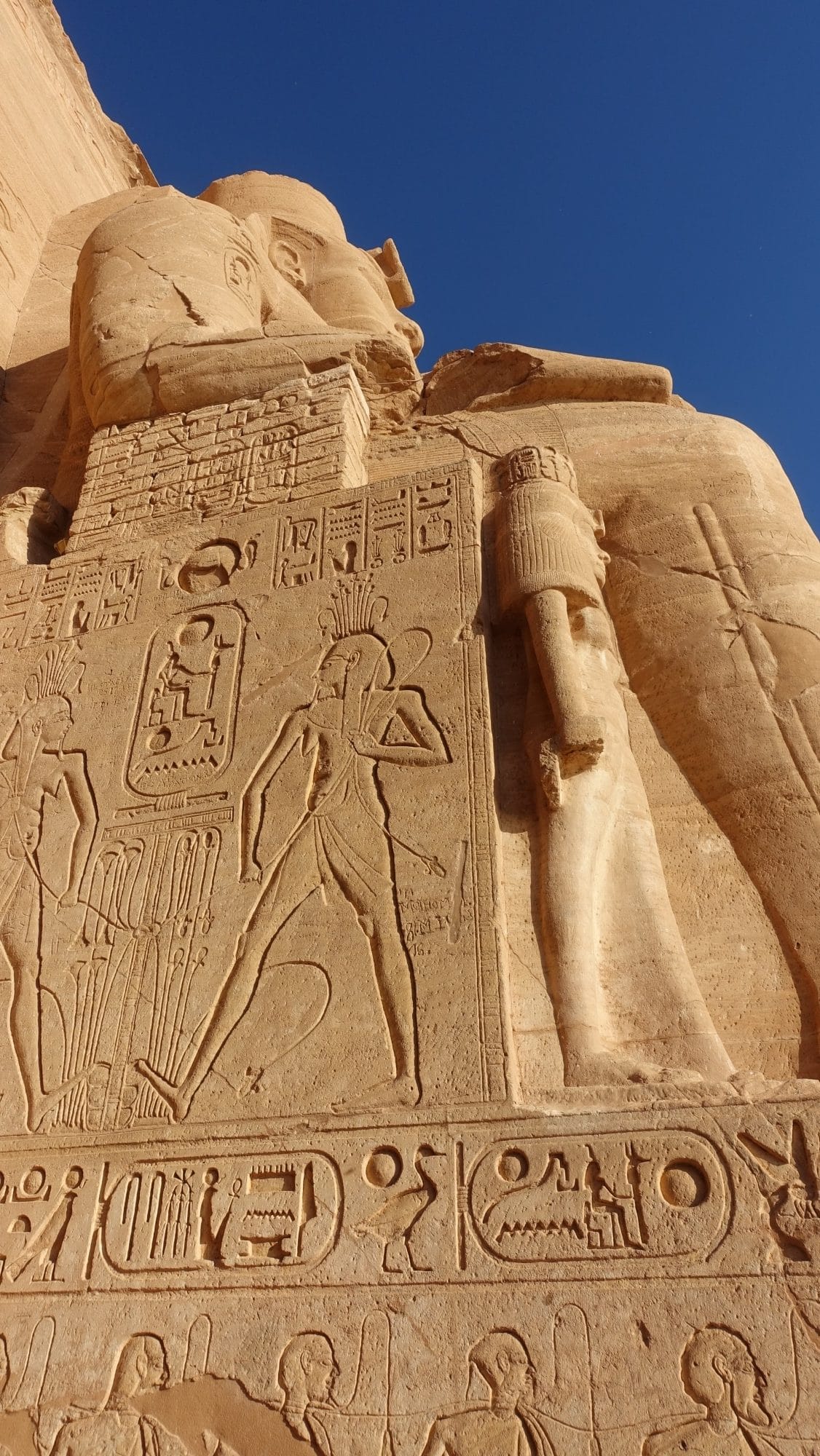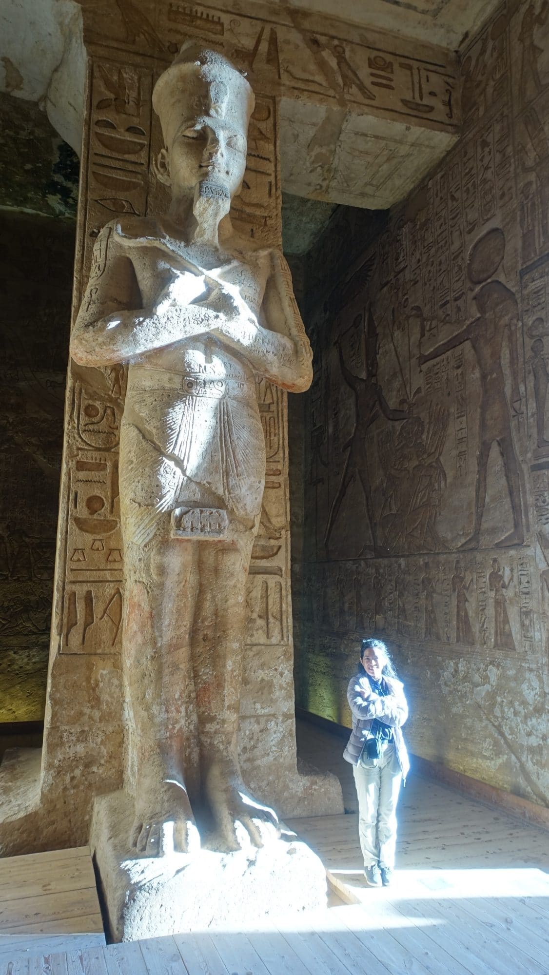Este templo é dedicado a Nefertari, mas Ramsés II também não é esquecido, há 2 Nefertari e 4 Ramsés II lá fora. Para vos dar uma ideia do tamanho destas estátuas, estou a colocar outra fotografia. Eu não sou pequeno, é a estátua que é grande 😀