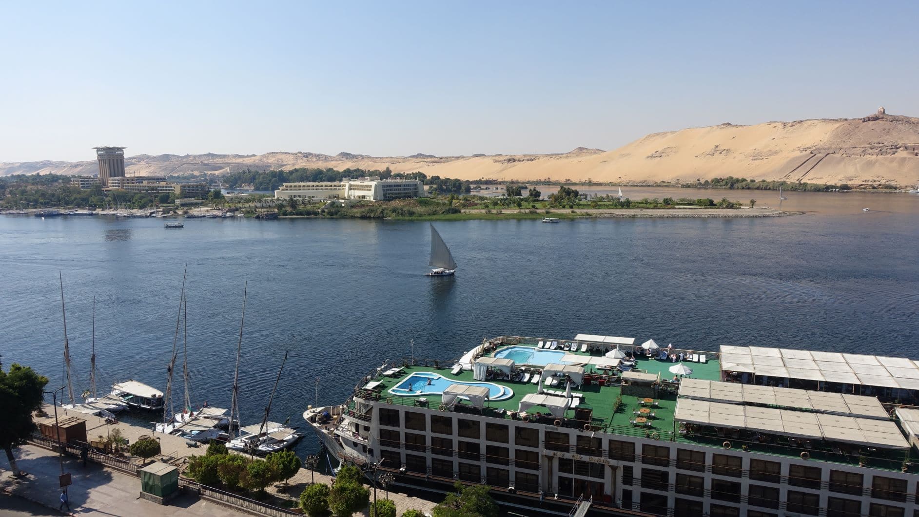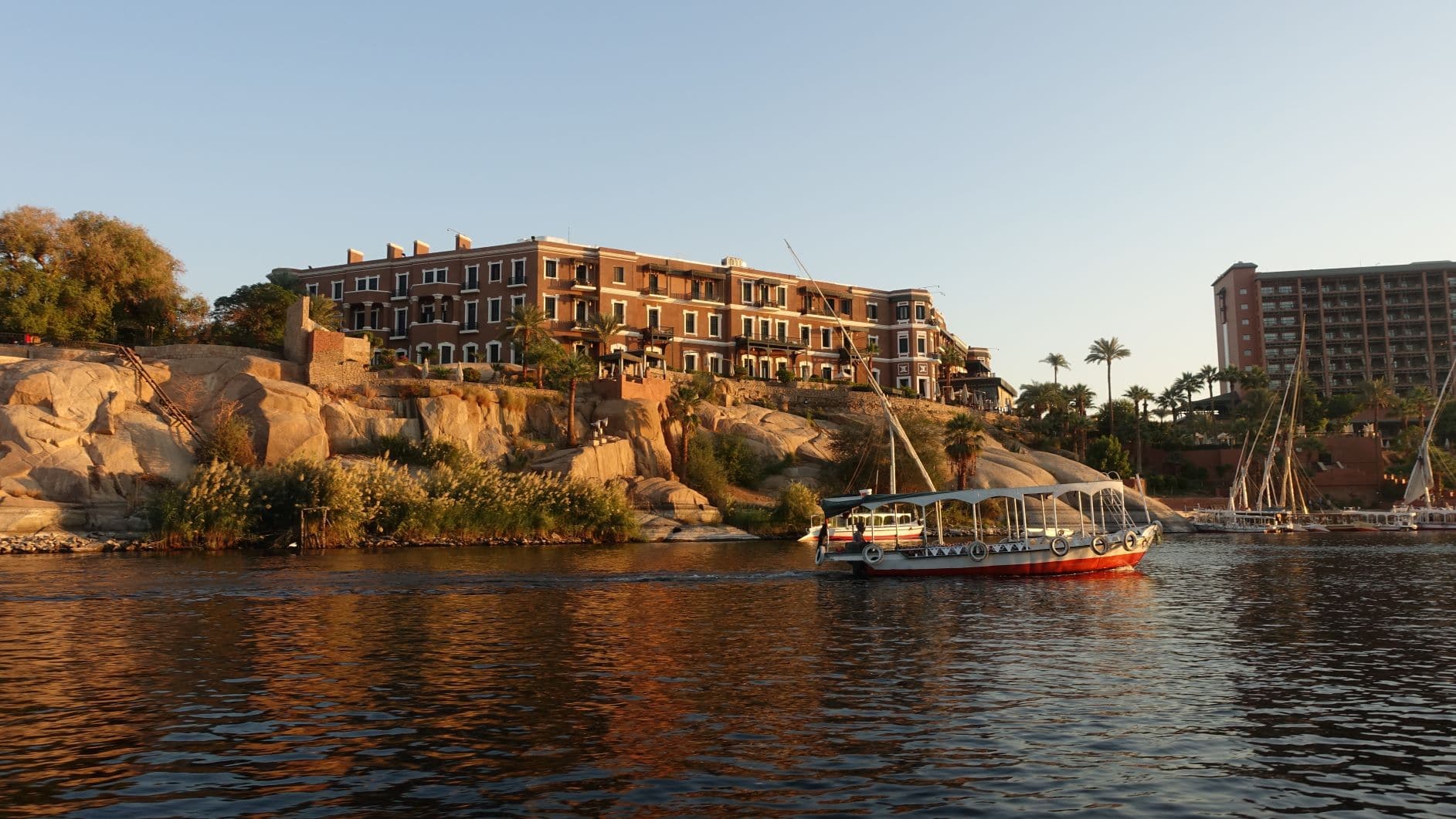 Às 16h, nosso guia nos pega e nos leva a um restaurante no Nilo, com vista para a Ilha do Elefantino (parte “templos”). Temos de apanhar um barco motorizado para lá ir. No caminho, passamos em frente ao Old Cataract, o famoso hotel visto em “Murder on the Nile”, onde a própria Agatha Christie se hospedou