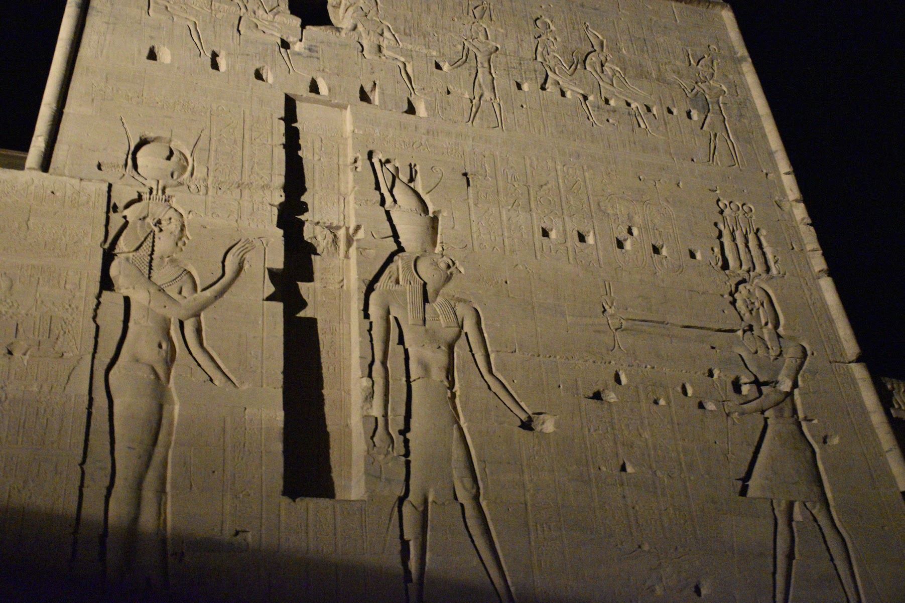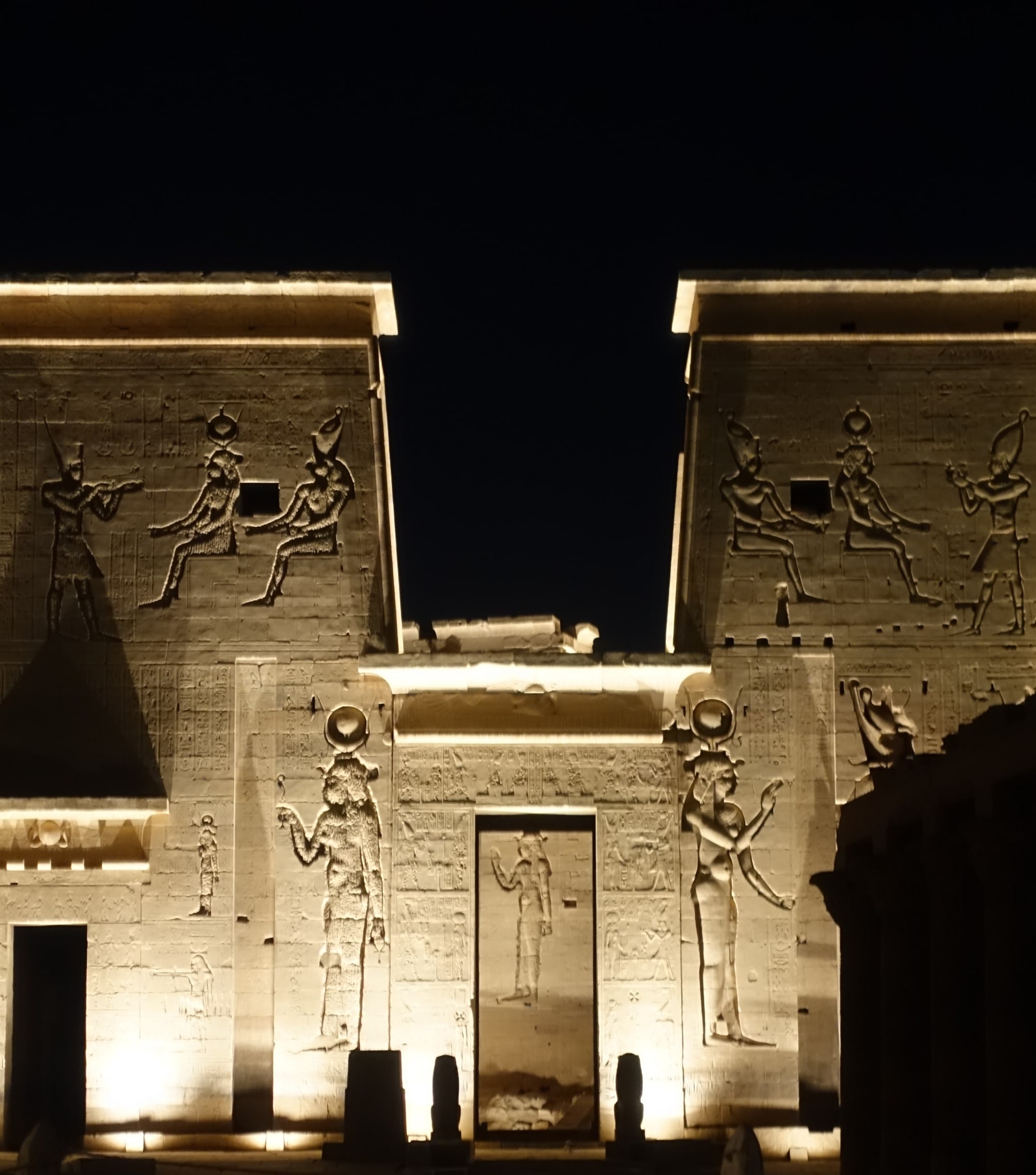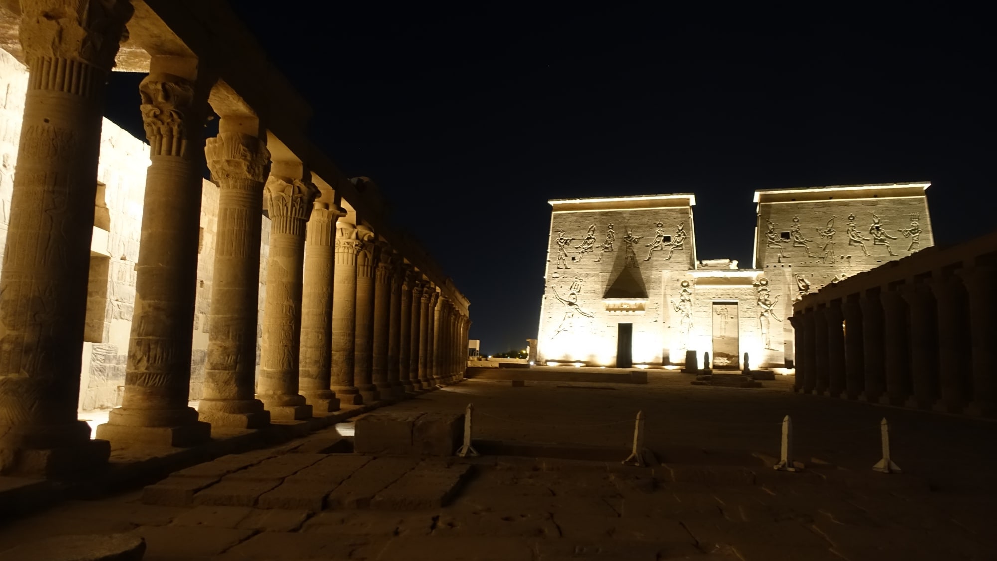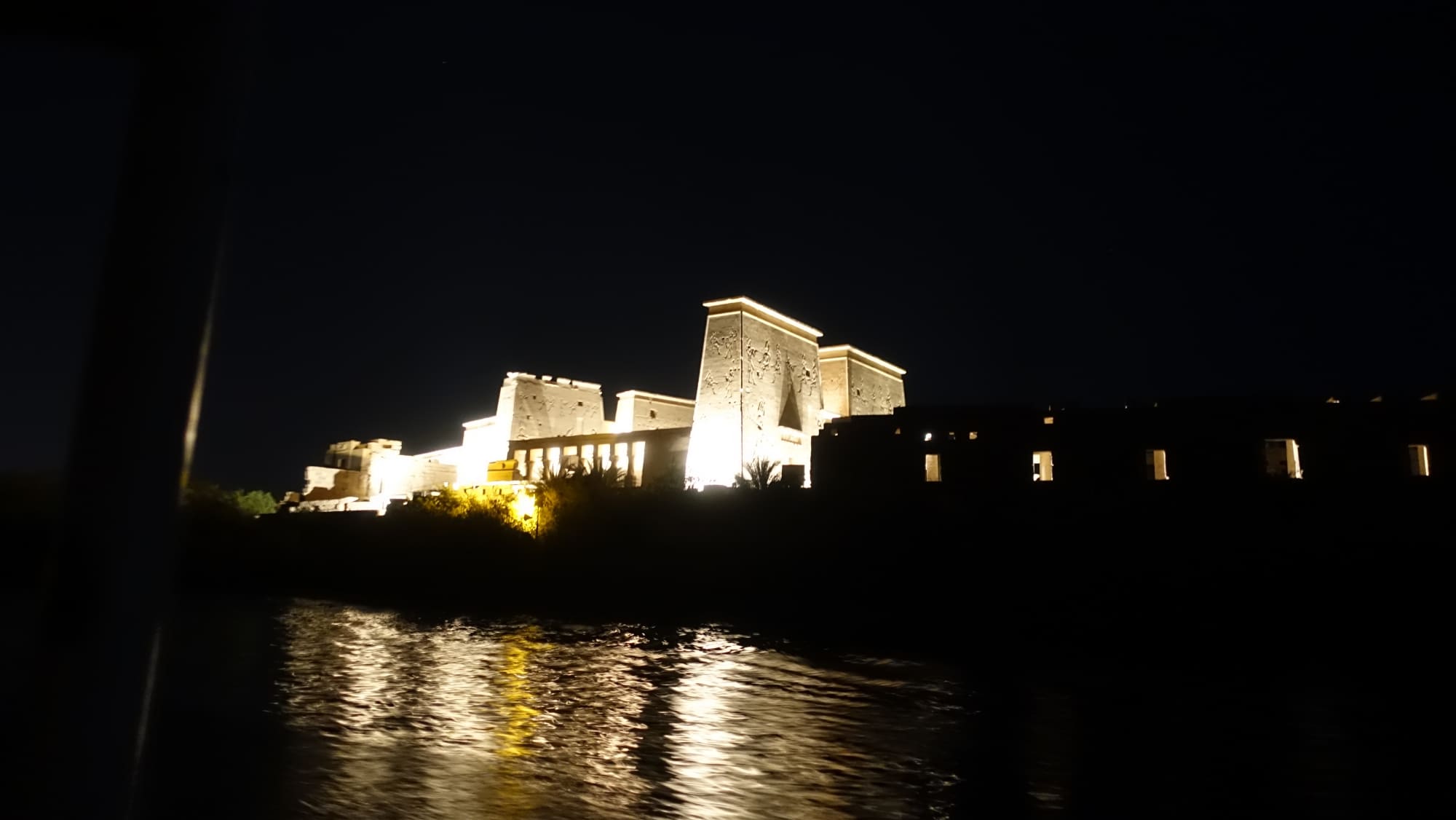 Depois voltamos novamente ao templo de Filae, desta vez para assistir ao espectáculo de som e luz. Lá nos encontramos com os nossos antigos companheiros de cruzeiro e o nosso antigo guia. Temos sorte porque esta noite só há cerca de vinte turistas, os outros saíram com o seu cruzeiro