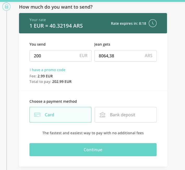 O princípio é muito simples: você envia dinheiro em euros para o Azimo (seja por transferência bancária ou por cartão de crédito). Você pode então retirar dinheiro em pesos argentinos de um parceiro Azimo na Argentina.