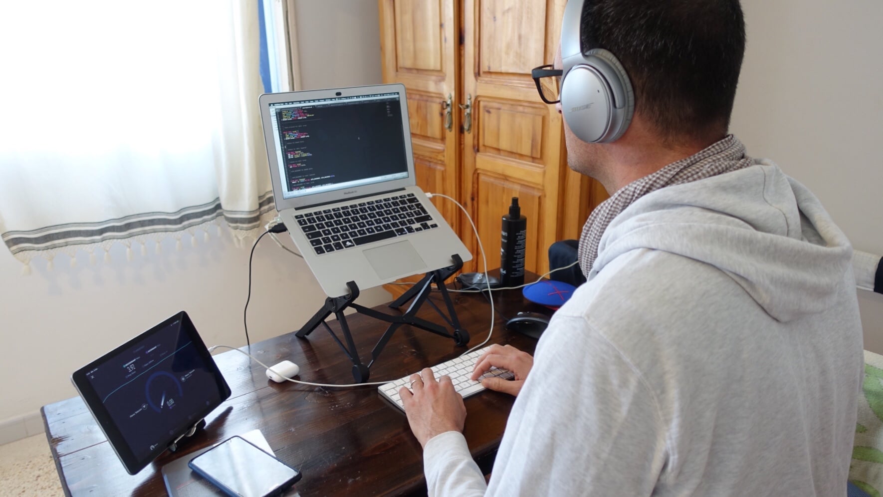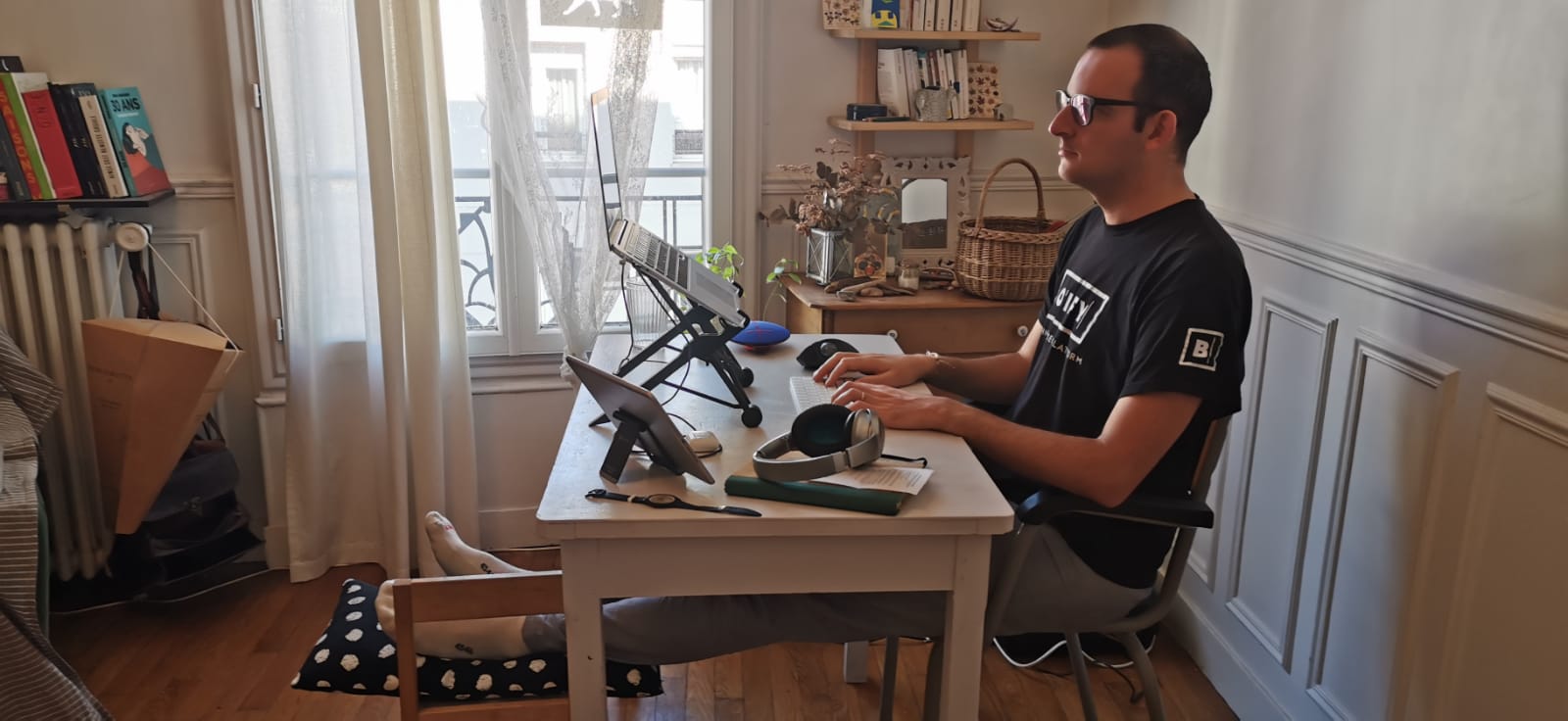 Trabalhando longas horas em frente ao nosso computador, eu realmente acho que você não deve fazer concessões na ergonomia do seu ambiente de trabalho. Então usamos um suporte para elevar o computador à altura certa, um teclado e um mouse ergonômico. Auscultadores de qualidade para chamadas telefónicas com os nossos clientes.