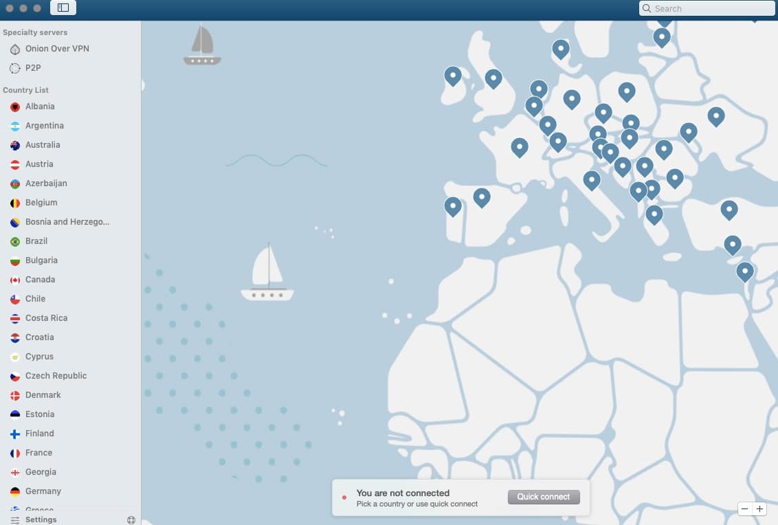 A vantagem é que é extremamente fácil de usar. Uma vez registrado, basta fazer o download do NordVPN (disponível no computador e smartphone), fazer o login e escolher o país do servidor de retransmissão que você deseja (62 países estão disponíveis).