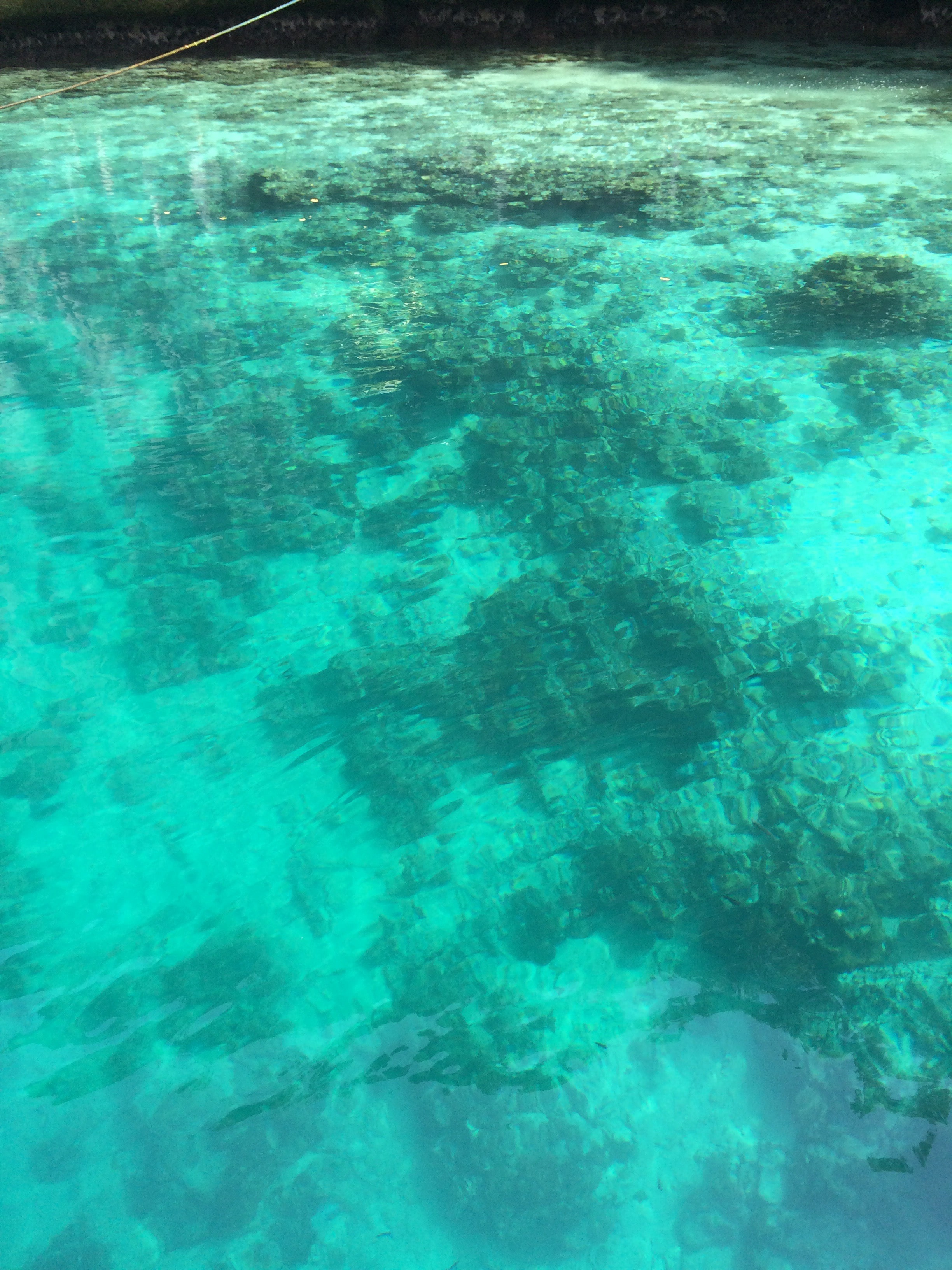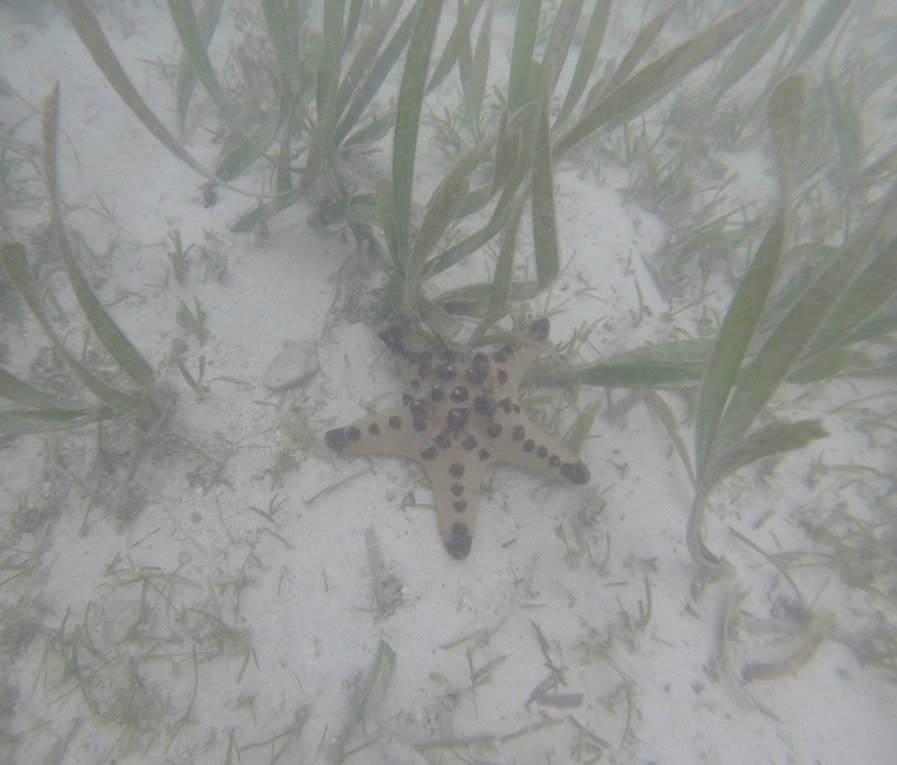 O que você vê na água? Uma estrela do mar enorme. Apesar da proibição de tocar em peixes/corais e outras coisas, os turistas chineses no nosso barco levaram esta estrela-do-mar para fora da água para levar selfies com ela. OMG!