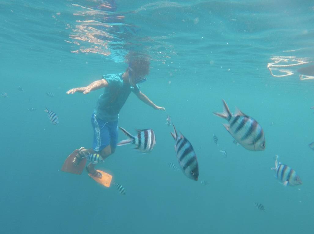 Depois visitamos o Skeleton Wreck, onde há muitos peixes (listrados), eles são muito sociáveis e nadam ao nosso redor. Eles são muito curiosos e infiéis: assim que um novo barco chega, eles nos largam para dar a volta ao outro barco e a outros turistas. Você ainda pode ver o barco muito bem quando está mergulhando, mesmo que a parte mais rasa esteja a 5 metros de distância. Aqui está JB snorkelling com os seus amigos, os peixes