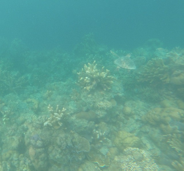 Fazemos snorkelling 2mn de barco de lá, no Reef Garden, e vemos uma grande tartaruga (veja foto abaixo, em cima à direita). Nós o seguimos por alguns minutos, até que ele desça muito baixo e se torne invisível. É mágico! Os corais são muito bonitos e mantêm cores lindas, ao contrário do El Nido