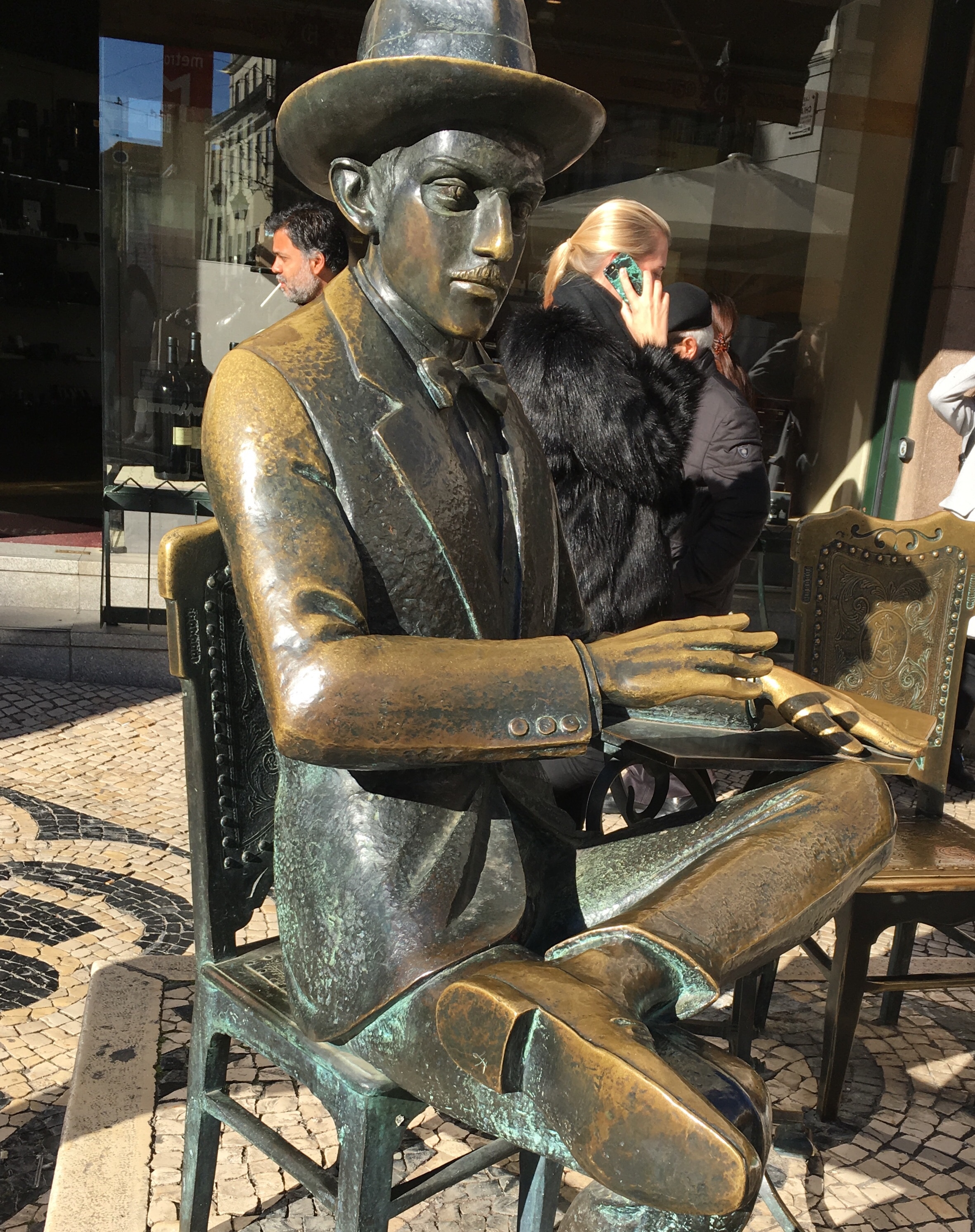 Cerca de 20 metros mais adiante encontra-se uma estátua do famoso poeta – e os terraços dos cafés. O lugar é muito bonito, especialmente quando está ensolarado. Lá você pode tomar um café, enquanto observa o bonde amarelo 28E passar (com sua cota de turistas e carteiristas).