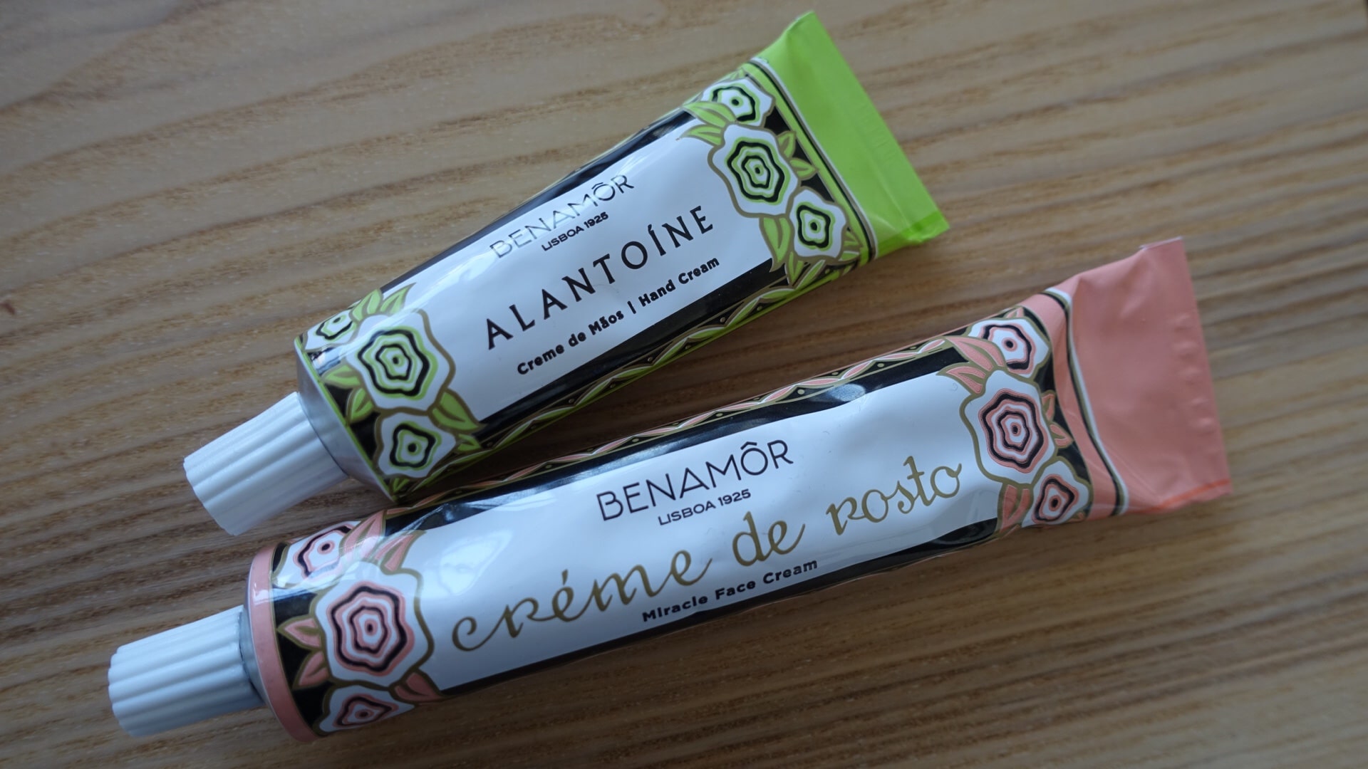 Primeiro, o de Benamôr. Criada por um farmacêutico, esta marca portuguesa com as suas próprias embalagens vintage foi adorada pela Rainha de Portugal Dona Amelia. Comprei-lhe dois best-sellers: o creme facial adorado pela rainha, e o creme para as mãos. Se o creme facial foi rapidamente atirado para o lixo (demasiados activos alergénicos que me dão espinhas), o creme para as mãos é excelente, torna as mãos macias e não pegajosas.