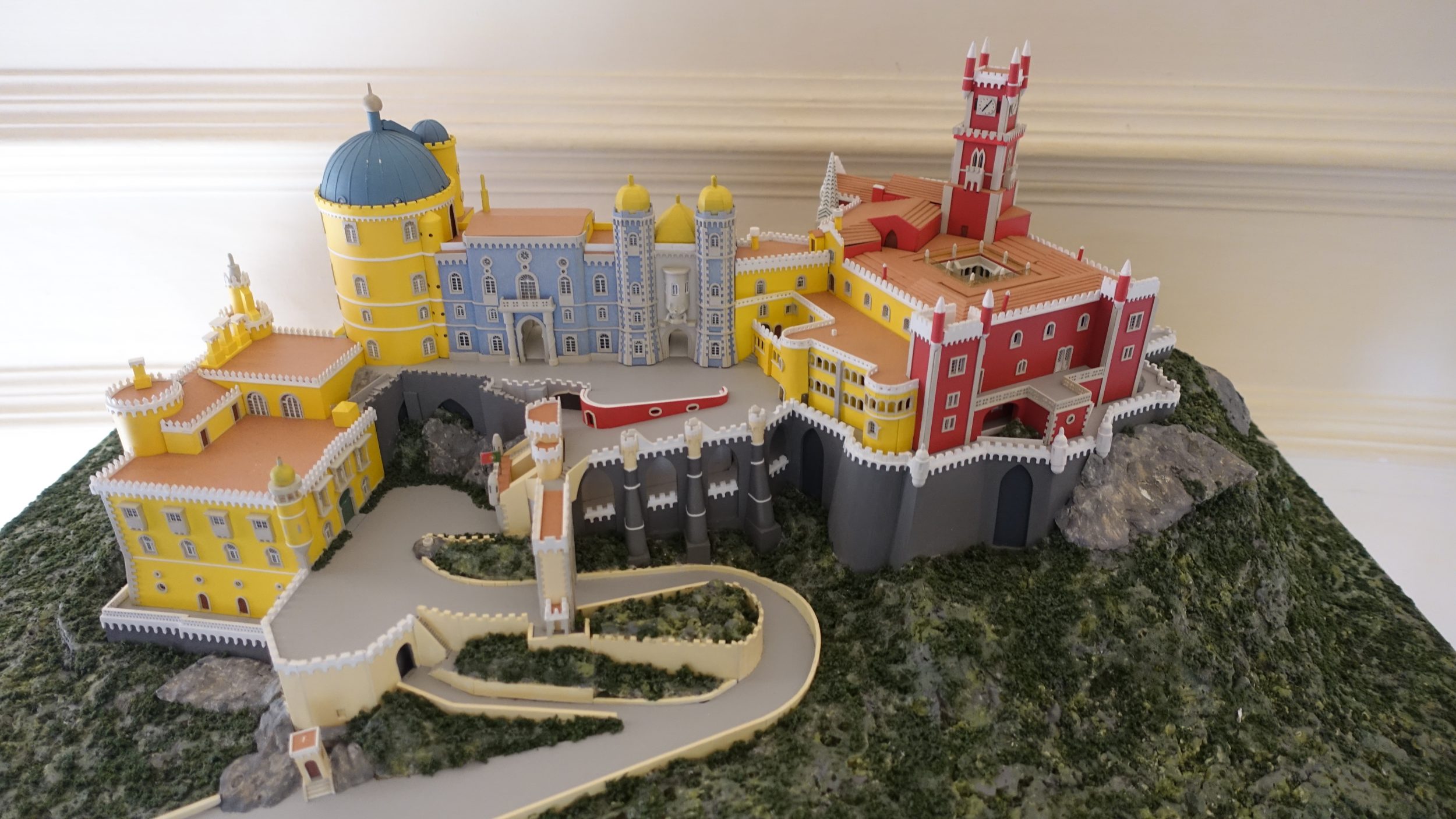 Estou a colocar o modelo do palácio para que vejas como é grande e bonito. A parte vermelha é o velho mosteiro. Adquirido em 1838, após a extinção das ordens religiosas em 1834, o mosteiro foi transformado em palácio. E o resto (o “Novo Palácio”) foi acrescentado depois. Isto explica a mudança de decoração e arquitectura quando se muda de uma parte do palácio para a outra.