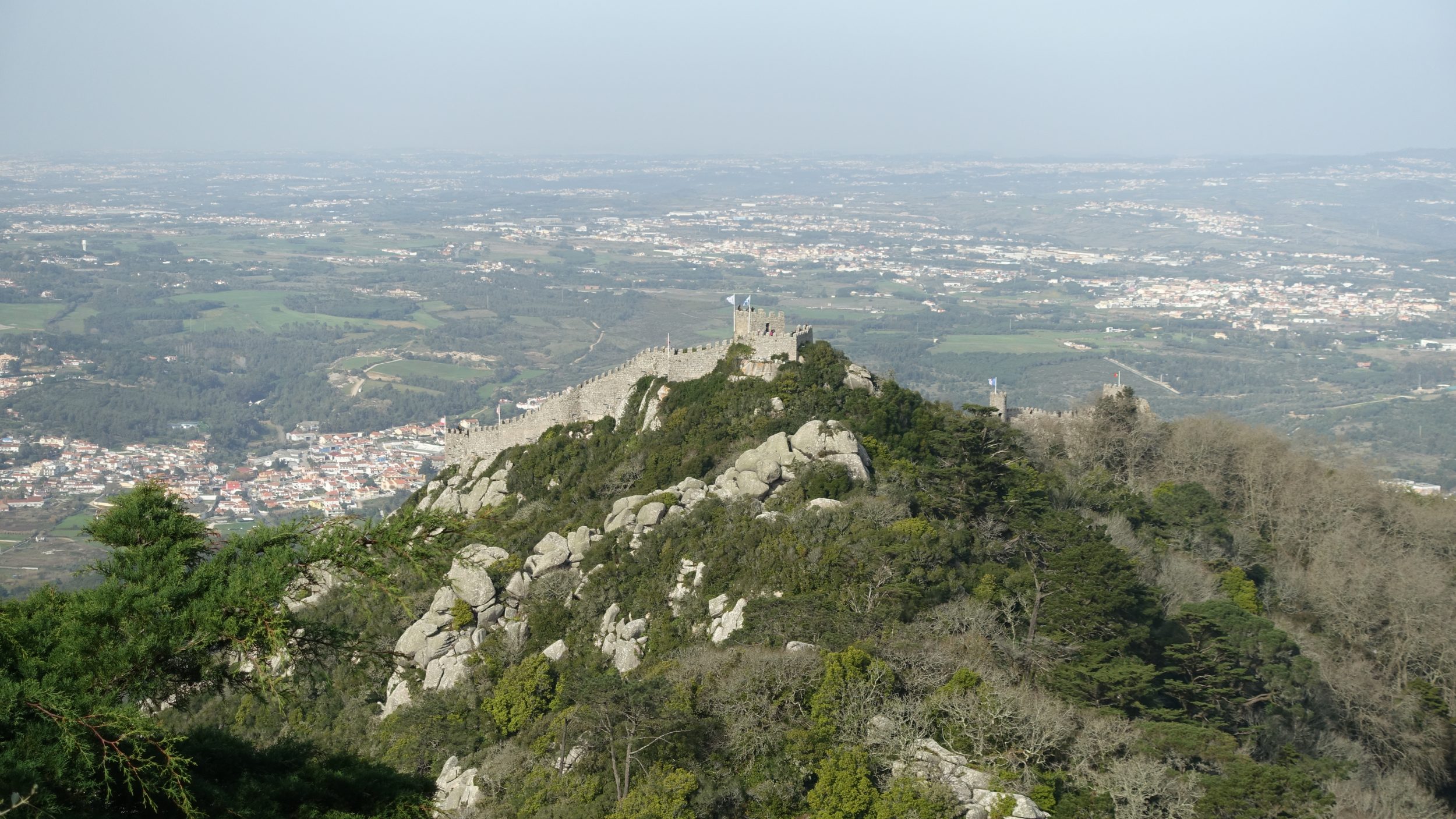 Se você seguir a seta “andar na parede”, verá isto: o castelo mouro de que falei antes. Fiz zoom total com a minha câmara. Na verdade não é assim tão perto, mas você pode ver muito, muito bem. Tem cuidado, há muitas correntes de ar aqui, por isso leva as tuas roupas quentes.