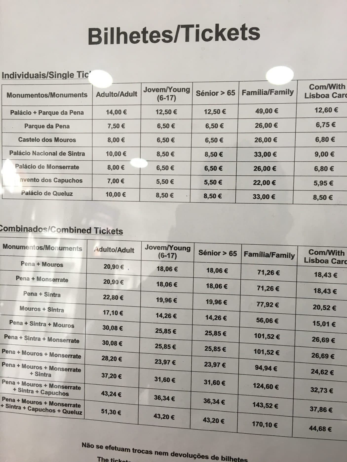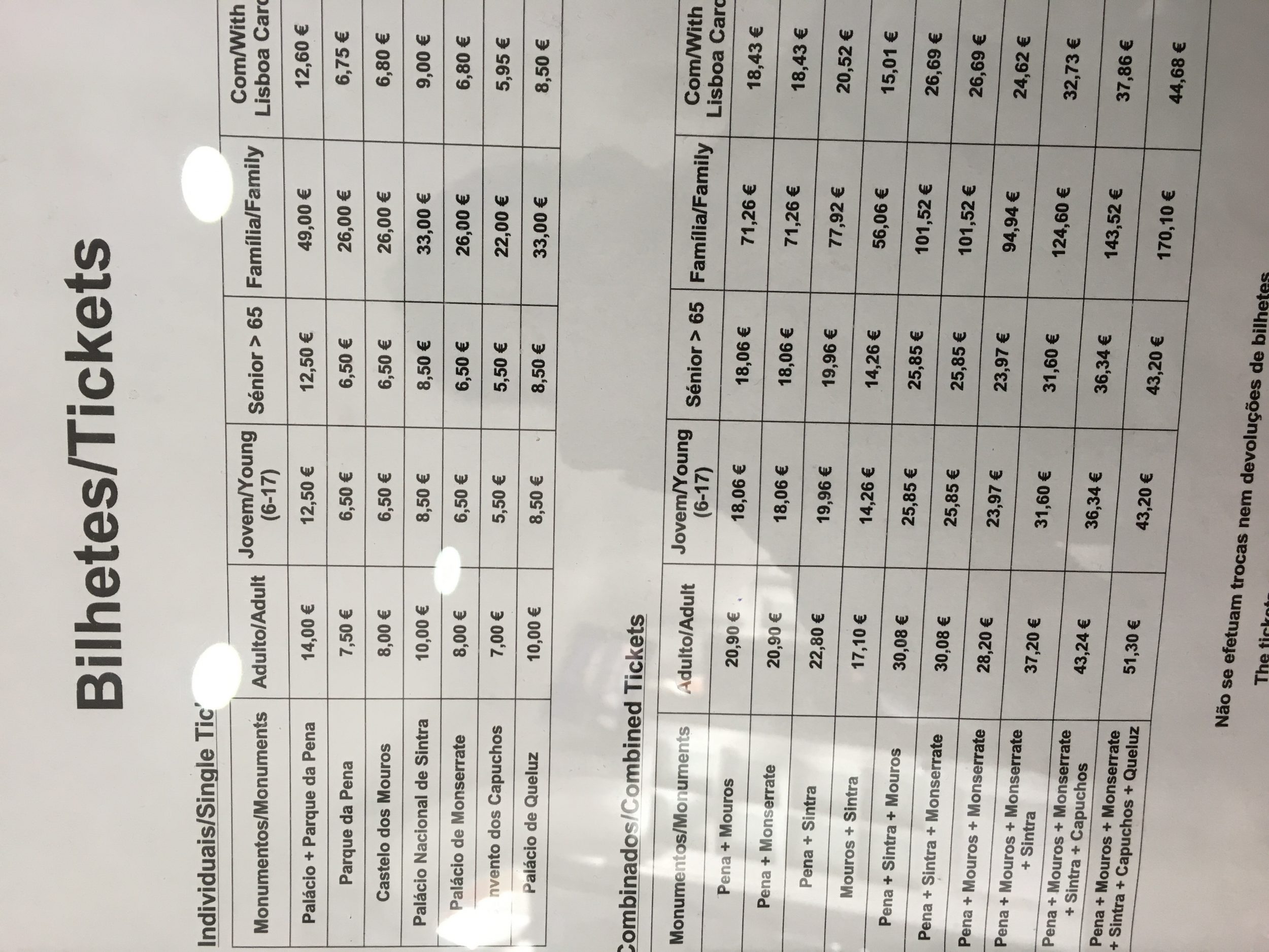 Coloco aqui os preços dos bilhetes de entrada + bilhetes combinados para Sintra (clique aqui para fazer o download da foto)