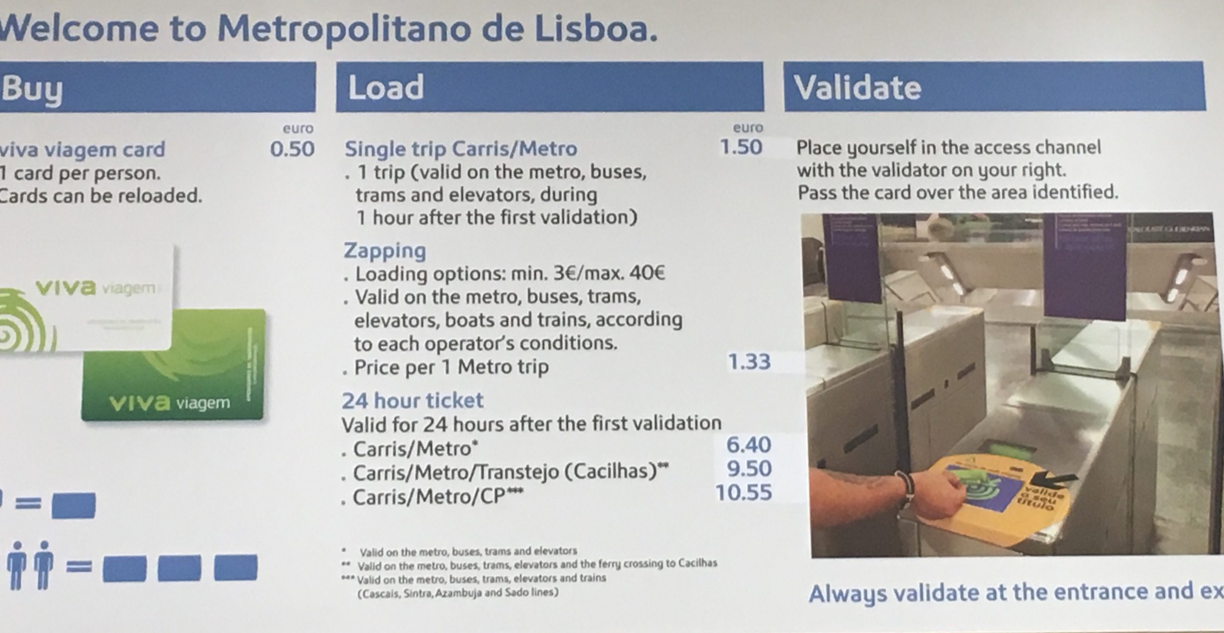 - Transporte : o metro e o eléctrico são seus amigos. Opte pelo pacote de 24h a 6,4 euros (que lhe permite apanhar o metro, eléctricos, autocarros e elevadores). Eu coloquei os detalhes na foto abaixo. Faça zoom para ver a diferença entre os pacotes de 6,4 euros, 9,5 euros e 10,55 euros. Nota: se o seu hotel não estiver muito longe da estação de metro Baixo-Chiado, o 1º dia de visita pode ser feito a pé, sem qualquer problema.