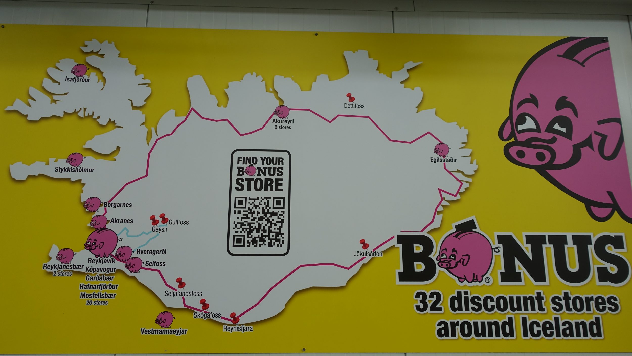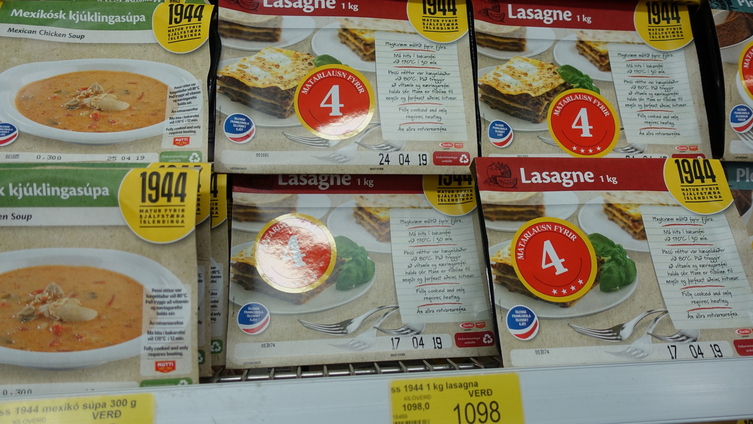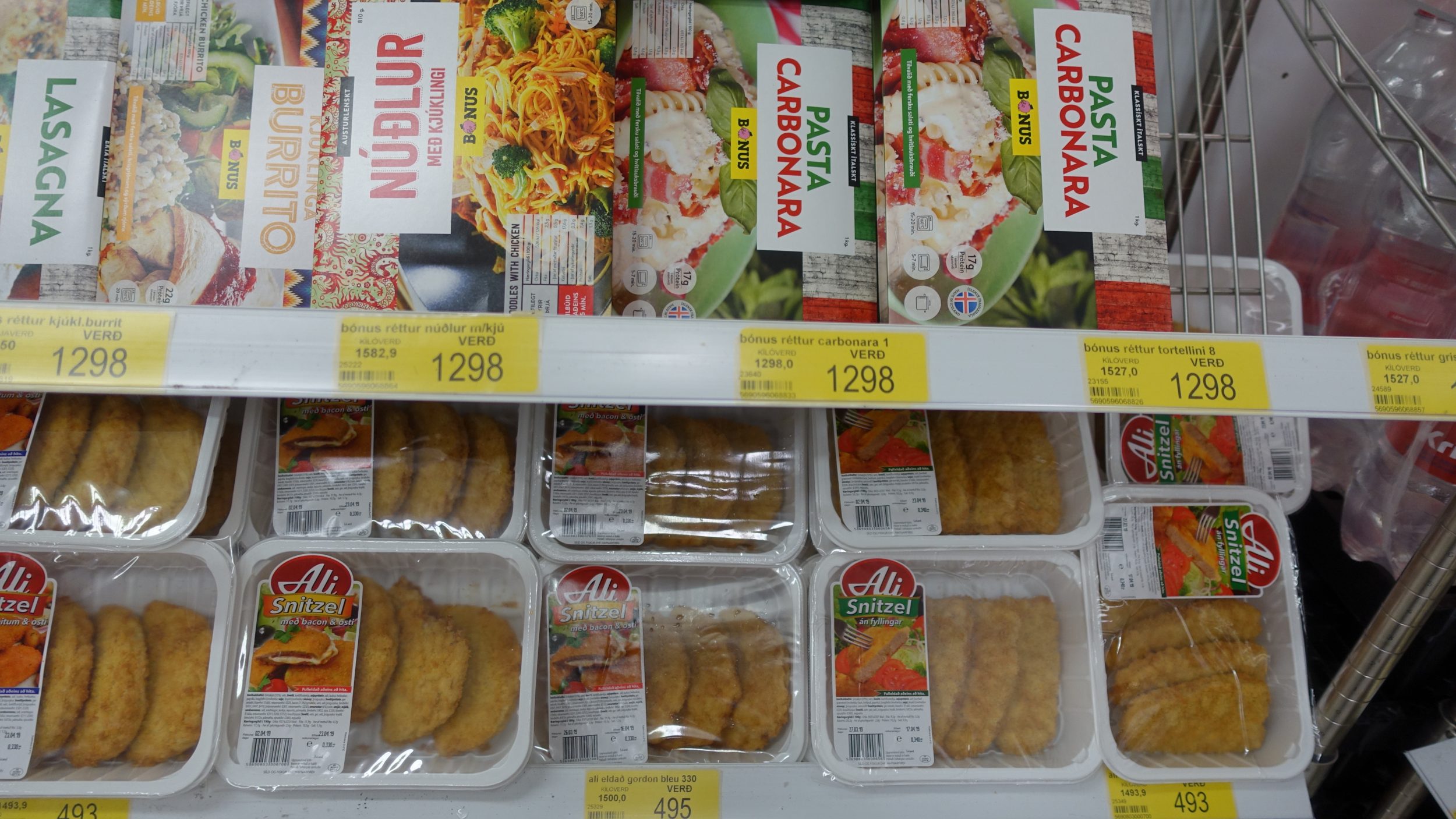 Primeira parada: o supermercado Bonus discount, onde os turistas fazem suas compras antes de partir em uma viagem de carro. Os islandeses também vão lá, não só os turistas. Eu tirei algumas fotos de alguns dos produtos para que você possa ver os preços. Basicamente, quando não contém carne, os produtos são 50% mais caros do que em França. Quando há carne, é uma história diferente. Por exemplo: um prato preparado custa cerca de 8 euros.