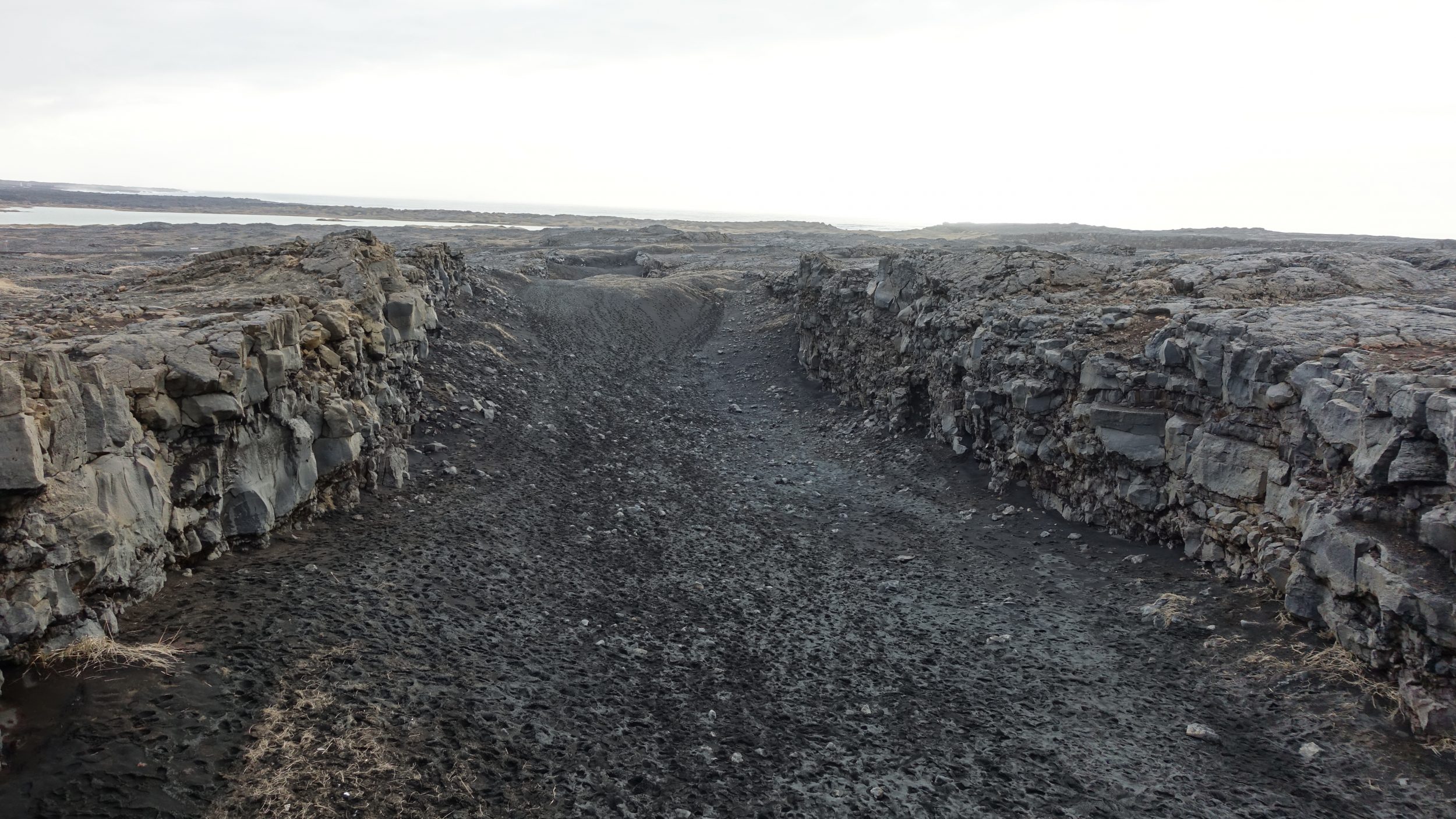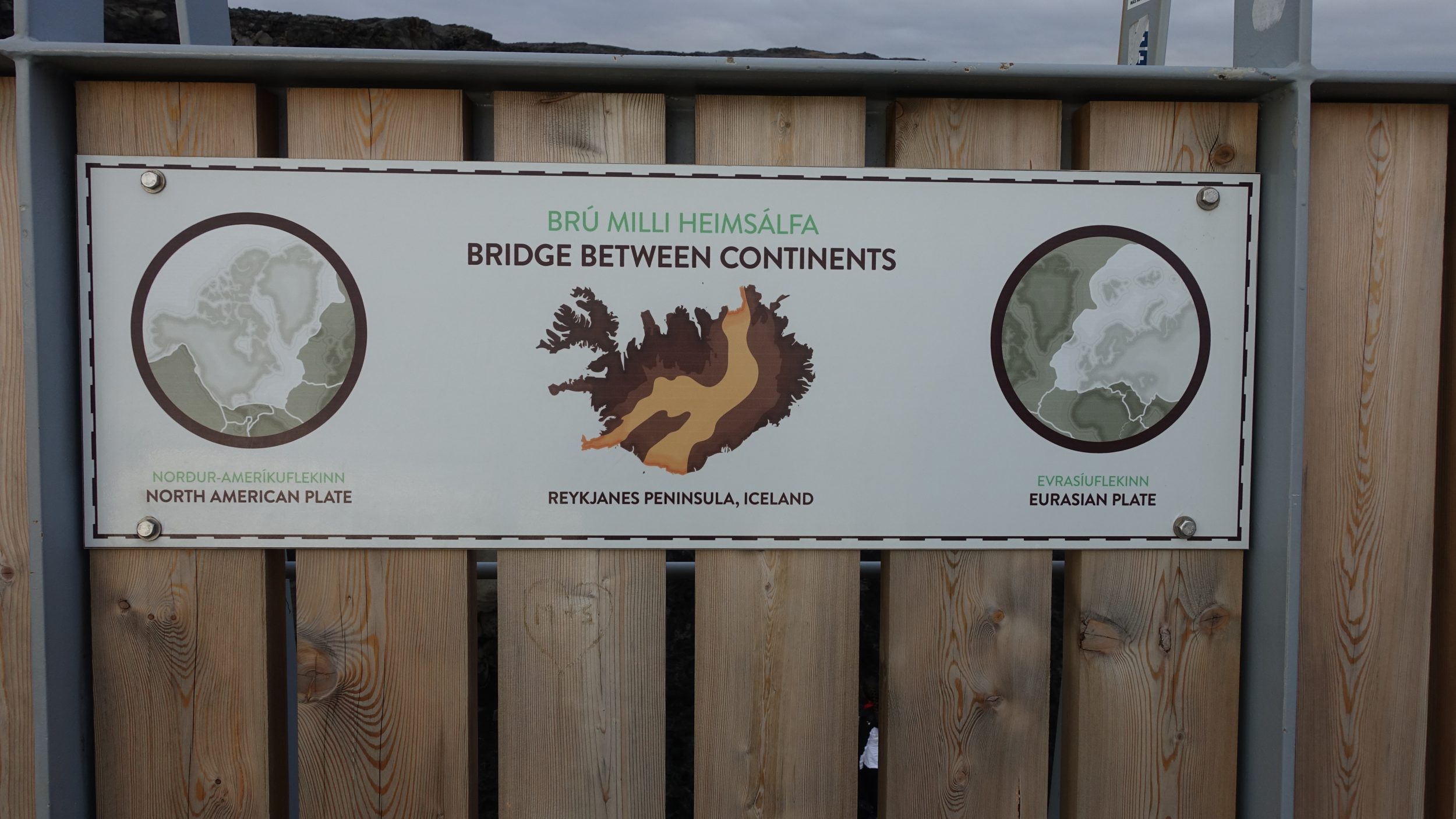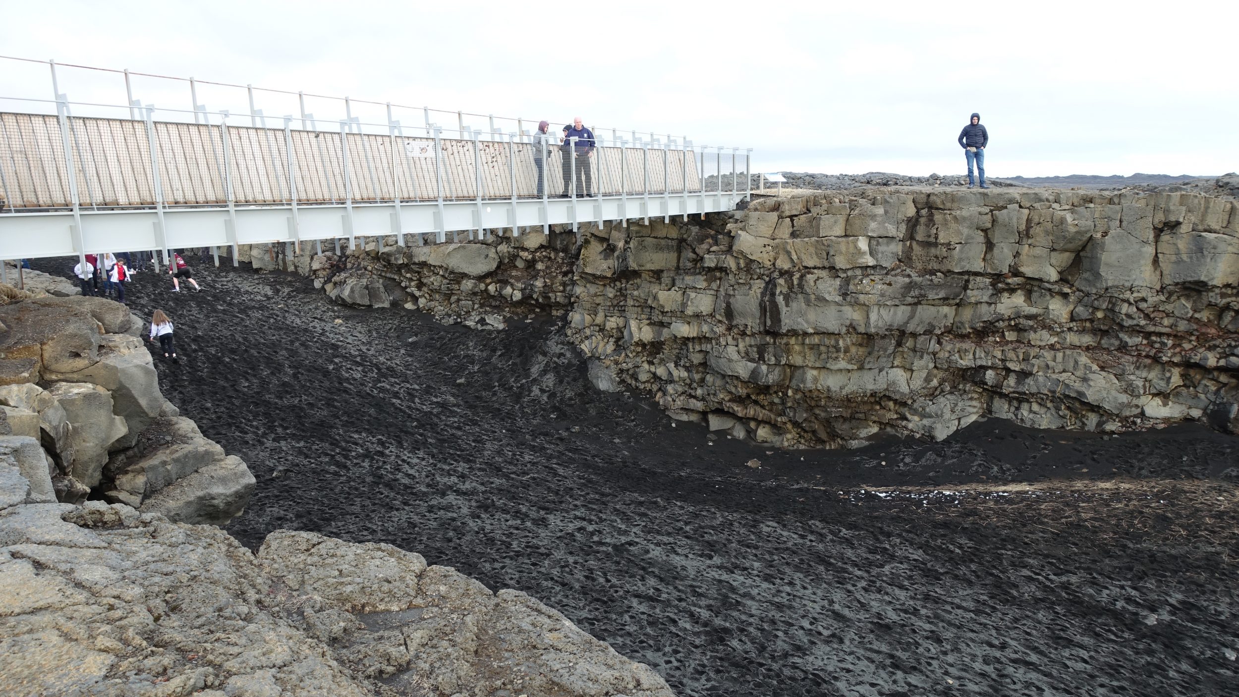 A segunda paragem é esta ponte que abrange dois continentes (tipo brú milli heimsálfa no Google Maps). É verdade, porque a Islândia está em duas placas tectónicas. Há lugares na Islândia onde se pode ir do continente europeu para o continente americano em poucos segundos. E este lugar é um deles. As placas ainda estão em movimento, por isso o espaço que você vê ali vai aumentar alguns centímetros a cada ano.