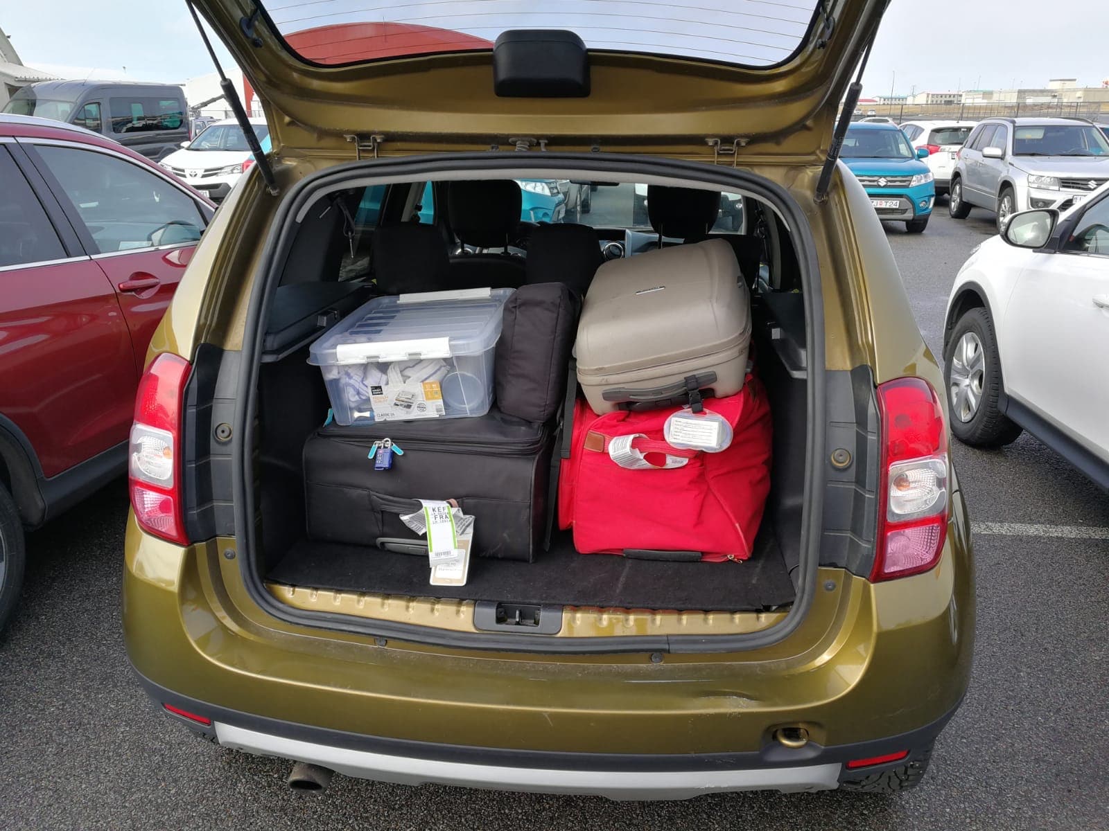 Tem uma cor muito fácil de reconhecer (verde mostarda). Por causa de muitas coisas compradas para a Islândia (e uma caixa de cozinha alugada para a ocasião), temos de acrescentar uma mala extra, e estamos encantados por ter um baú enorme.