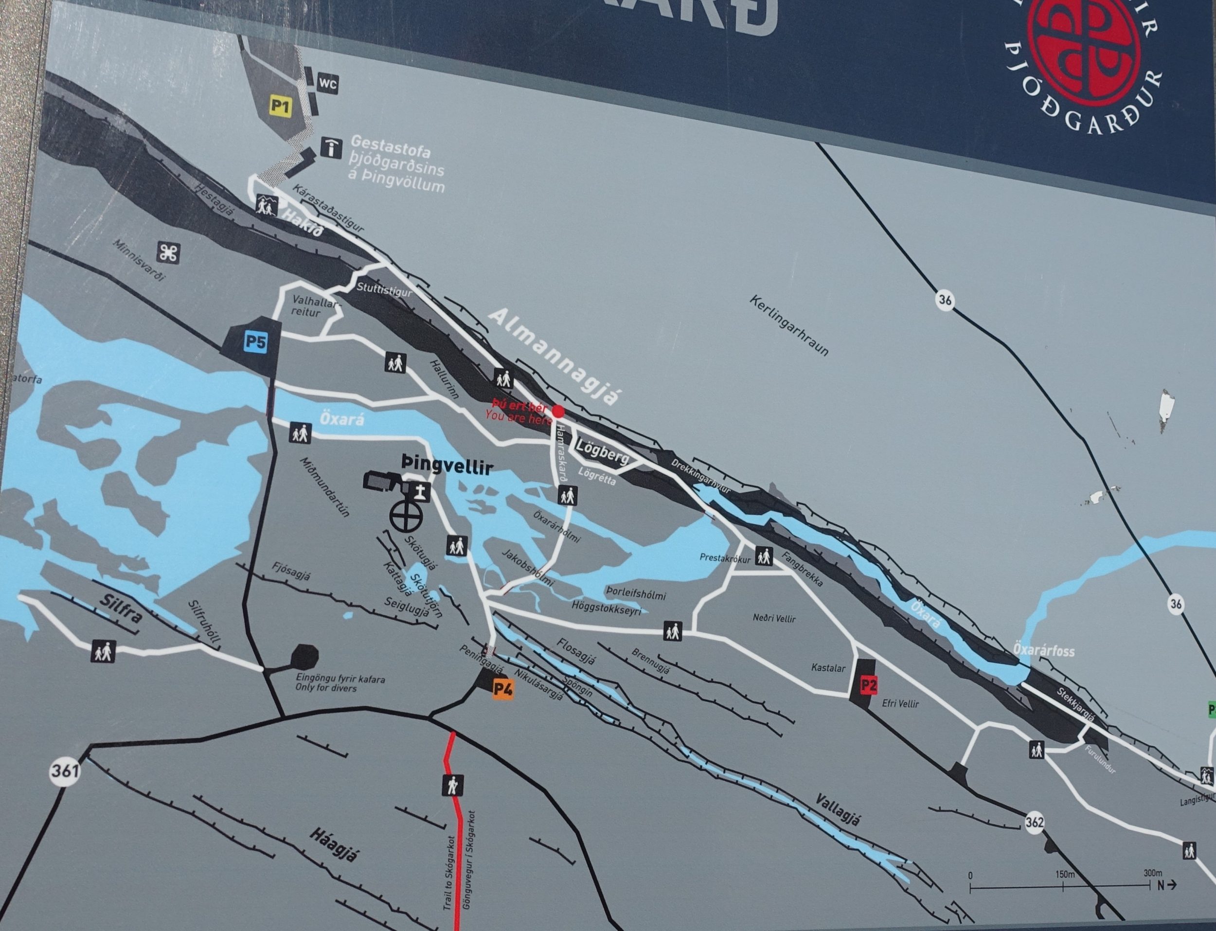 Apontar para Þingvellir Parking P2 on Waze. De lá você estará entre 500 e 800m dos principais pontos do parque. Coloquei aqui um screenshot do Maps.me e o mapa do parque que tem mais detalhes do que o Google. O estacionamento P1 é mais frequentado por autocarros de turismo (perto de Hakid). O estacionamento é pago (730 kr por dia) e é absolutamente necessário pagar online, portanto lembre-se de instalar agora o aplicativo Myparking.is
