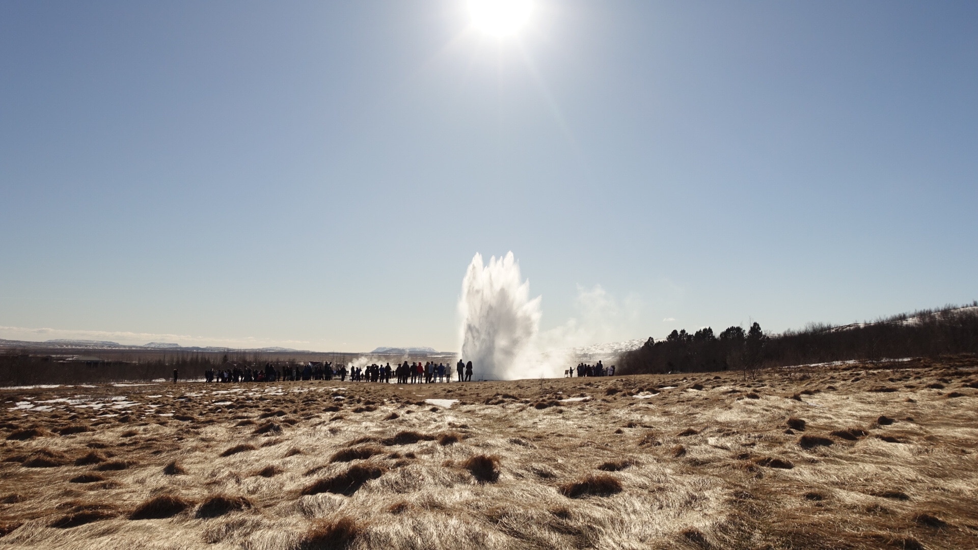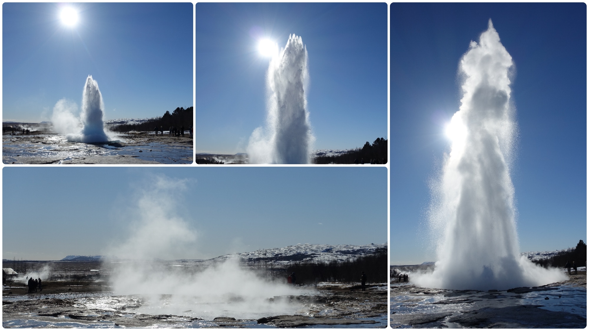 Vamos para o campo geotérmico de Haukadalur, onde se encontra o géiser Geysir. Na verdade, foi ele quem deu o nome a todos os gêiseres. Agora está desligado, mas o seu colega Strokkur faz o espectáculo por ele a cada 3 a 10 minutos. Ficamos muito tempo e vemos que a água é impelida entre 2 e 10 metros aproximadamente (pode chegar a 30 metros). Parece um pote enorme cheio de água a ferver. Você tem que estar, se possível, do lado esquerdo do gêiser (em relação à entrada do local) para ver uma grande bola de água se formando logo antes da coluna de água. Você também pode ver o efeito “chuva” e um grande fumo se formando depois.