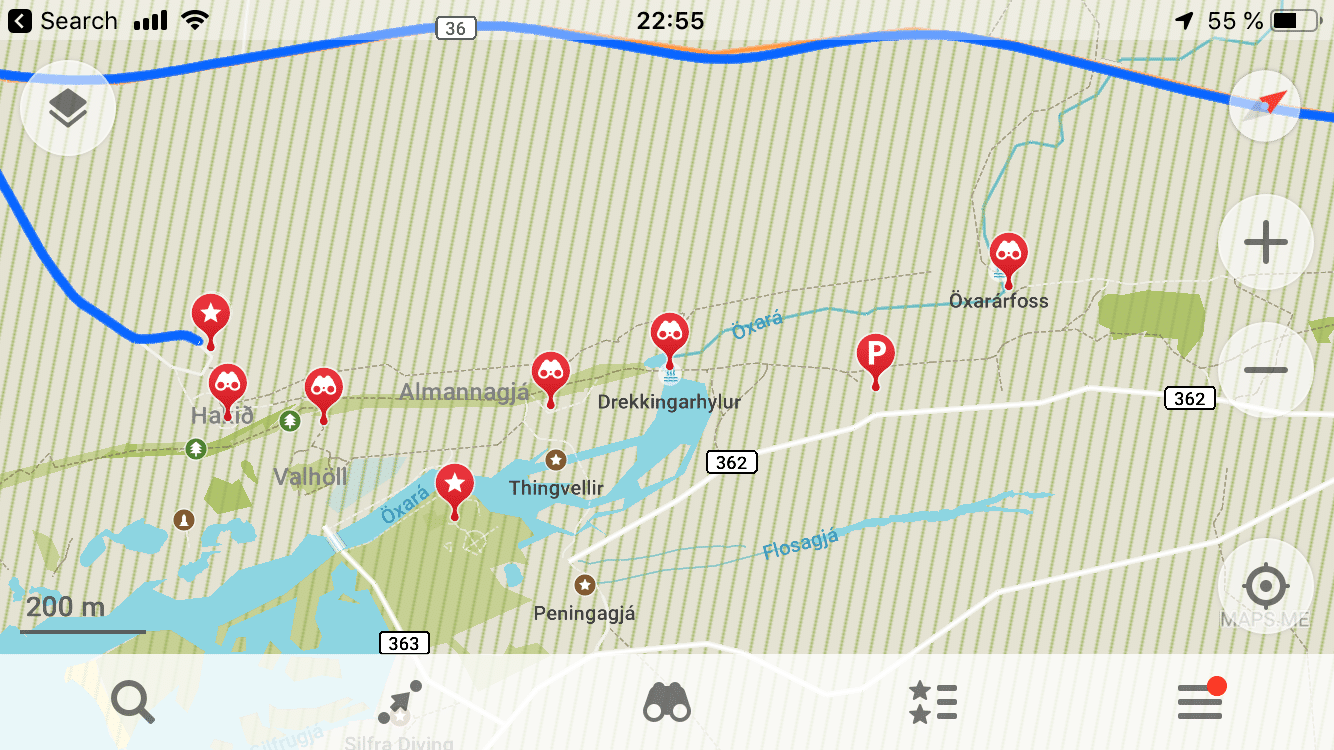 Para encontrar os estacionamentos (P2, P4, P5 etc.), consulte Waze ou Maps.me como Google Maps é um pouco mesquinho com pontos de interesse e explicações na Islândia. Para trilhas de caminhada (por exemplo, dentro de parques), o Maps.me é perfeito porque o Google maps não mostra nada 🙂