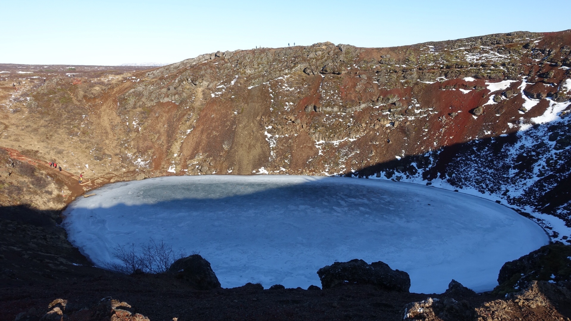 Foi aqui que o cantor Björk deu um concerto, sim, no coração da cratera de um vulcão de 6500 anos de idade. Você pode caminhar ao redor da cratera ou descer as escadas até o nível do lago. A beleza do lugar é esta rocha com faixas de ocre e preto