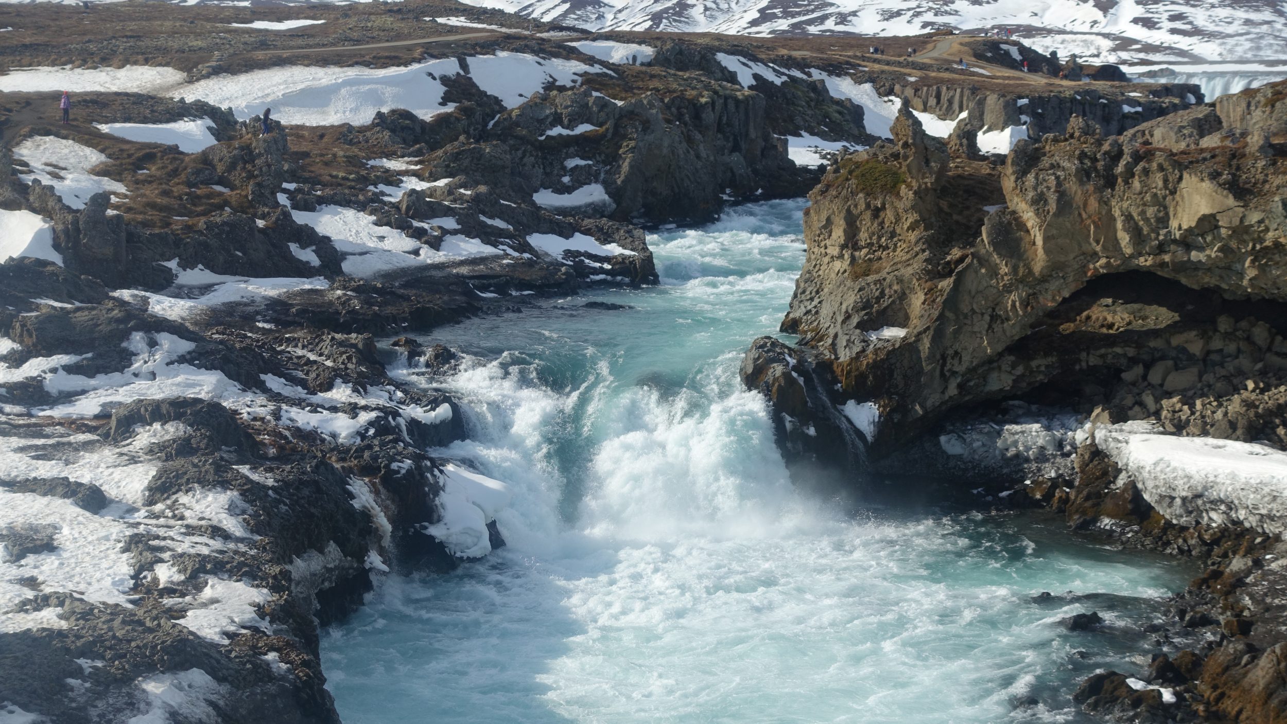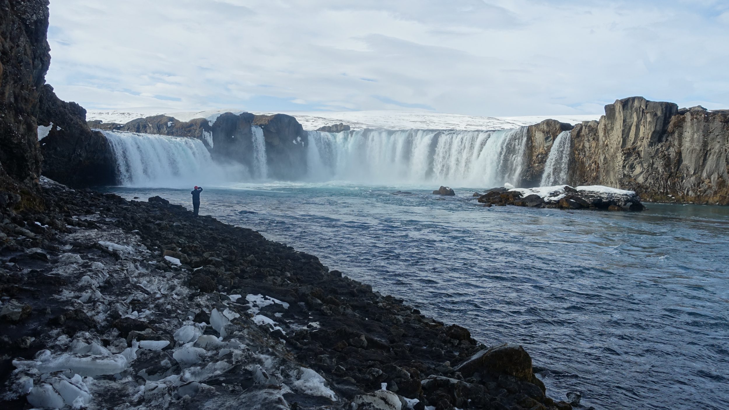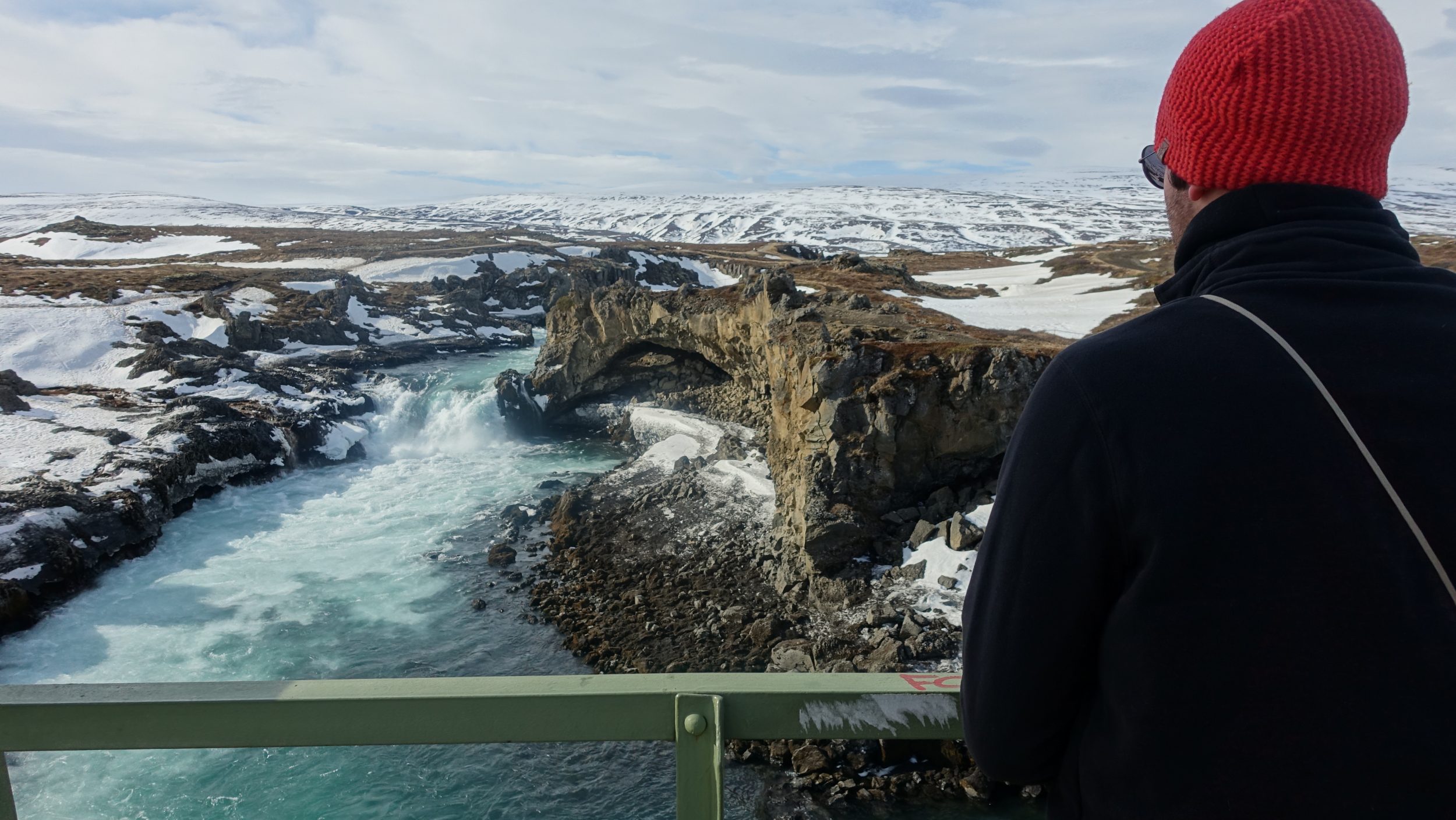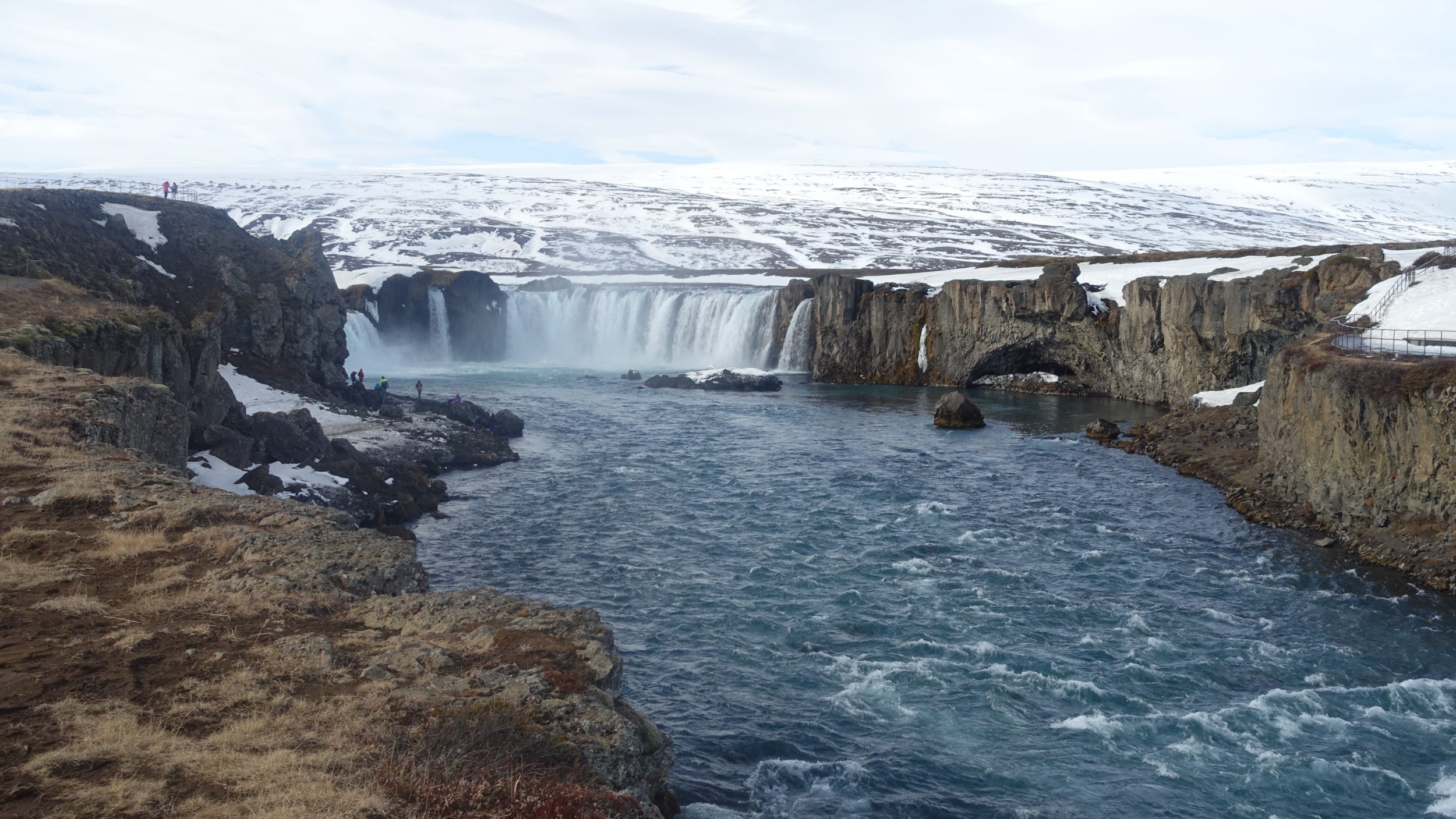 E então, seguimos, a pé, um caminho marcado para ir e ver a cascata Godafoss. Estamos felizes de estar estacionados deste lado porque podemos vê-lo melhor daqui (há também um parque de estacionamento do outro lado da cachoeira).