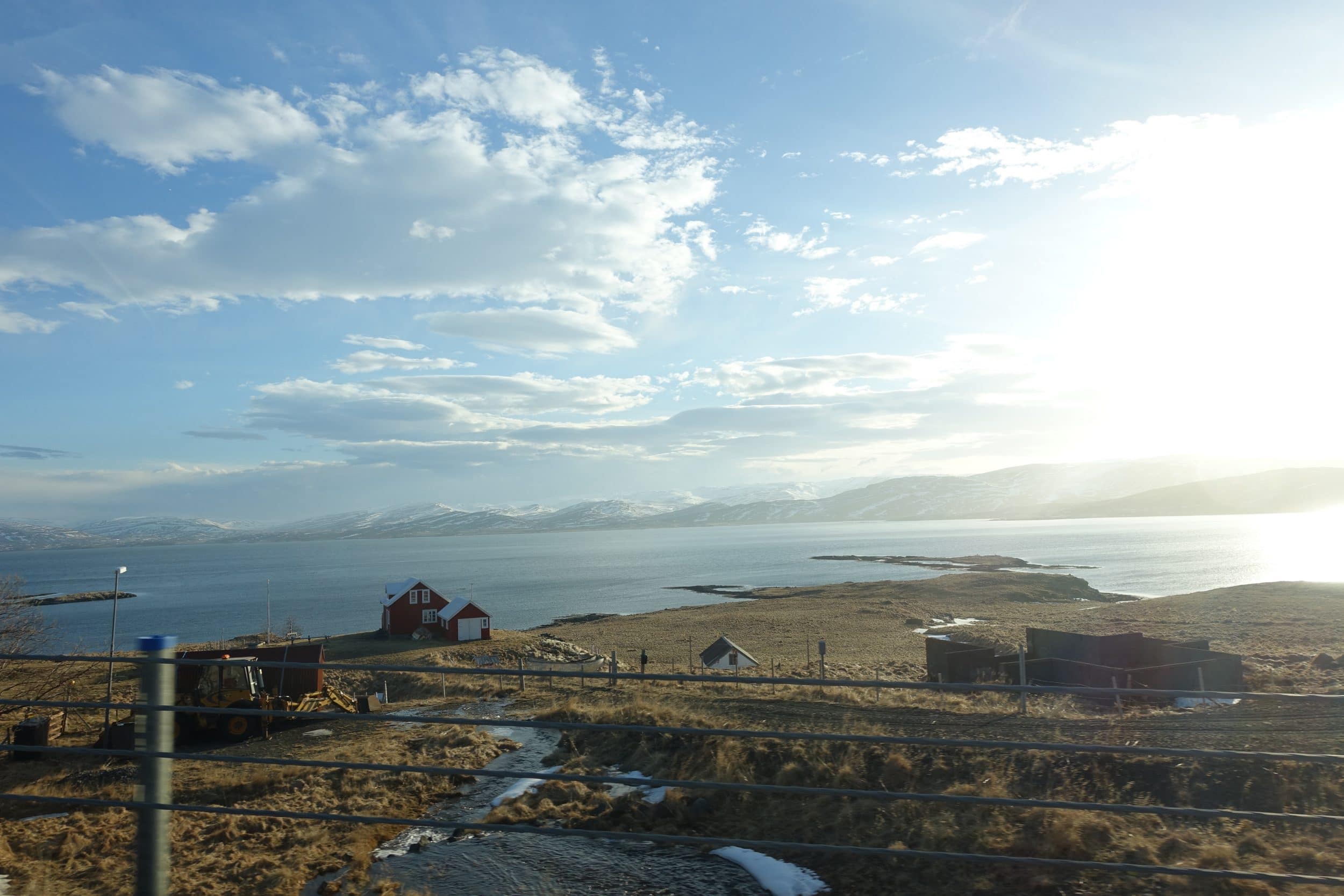Do outro lado do fiorde, vemos belas montanhas cobertas de neve
